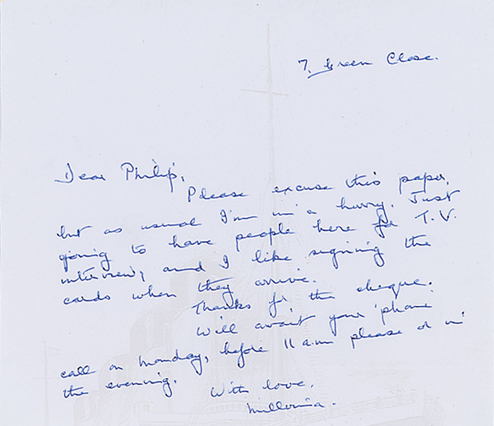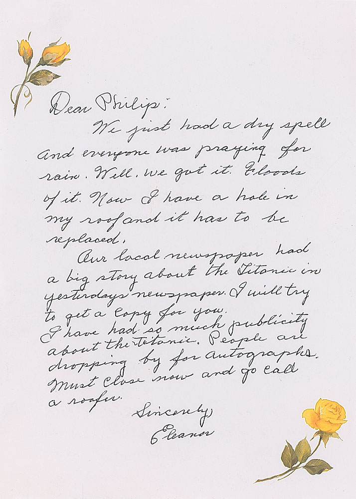 Two letters from Titanic survivors Millvina Dean and Eleanor Shuman: an ALS signed "Millvina," one page, 5.5 x 5, no date, addressed to Philip, in part: "Please excuse this paper but as usual I'm in a hurry. Just going to have people here for T.V. interview, and I like signing the cards when they arrive"; and an ALS signed "Eleanor," one page, 6.25 x 8.75, no date, also addressed to Philip, in part: "Our local newspaper had a big story about the Titanic in yesterday's newspaper. I will try to get a copy for you. I have had so much publicity about the Titanic. People are dropping by for autographs." In overall fine condition, with the bottom of the Dean letter trimmed off.