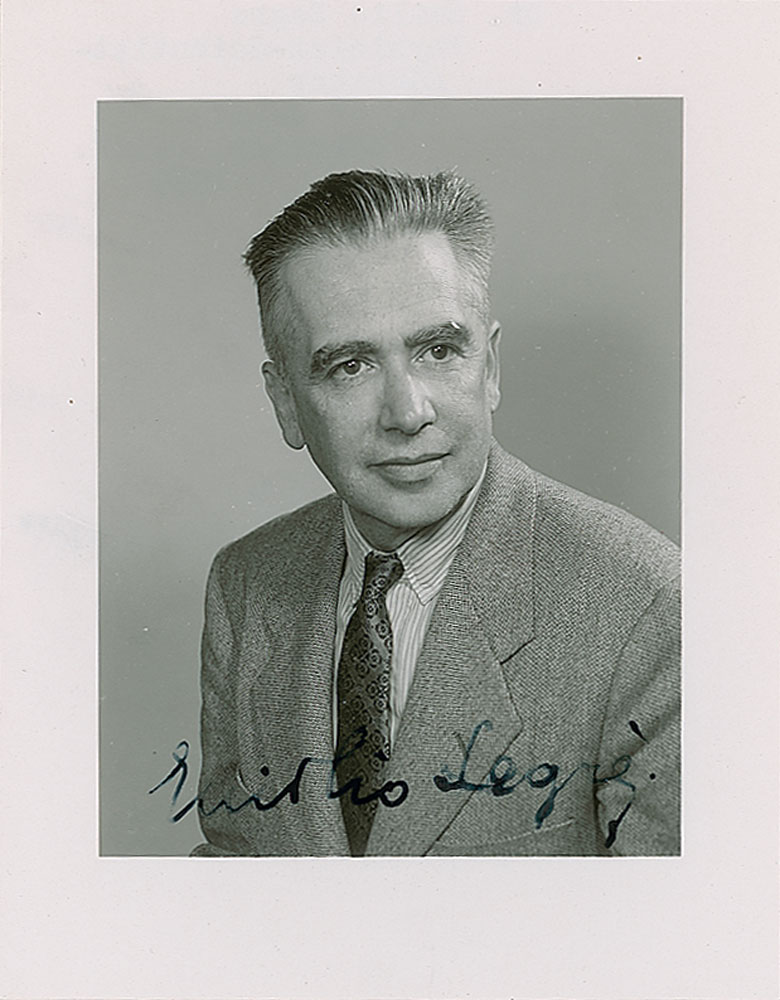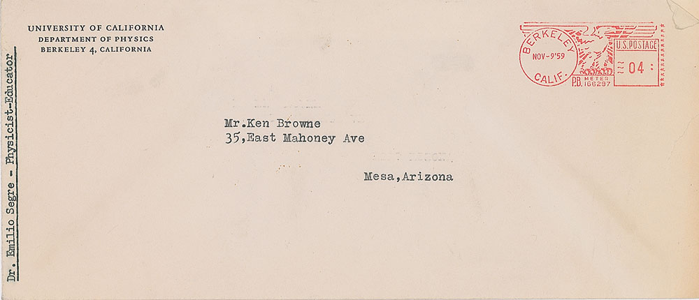 Italian-American physicist (1905-1989) who discovered the antiproton, worked as a group leader for the Manhattan Project, and won the 1959 Nobel Prize in Physics. Vintage glossy 4 x 5 photo of Segre from his time at the Berkeley Radiation Lab, signed in fountain pen. Reverse bears a Berkley ink stamp and a typed collector's notation indicating that it was received in 1959 In fine condition, with light surface impressions at the top from typed notations on the reverse. Accompanied by the original mailing envelope.