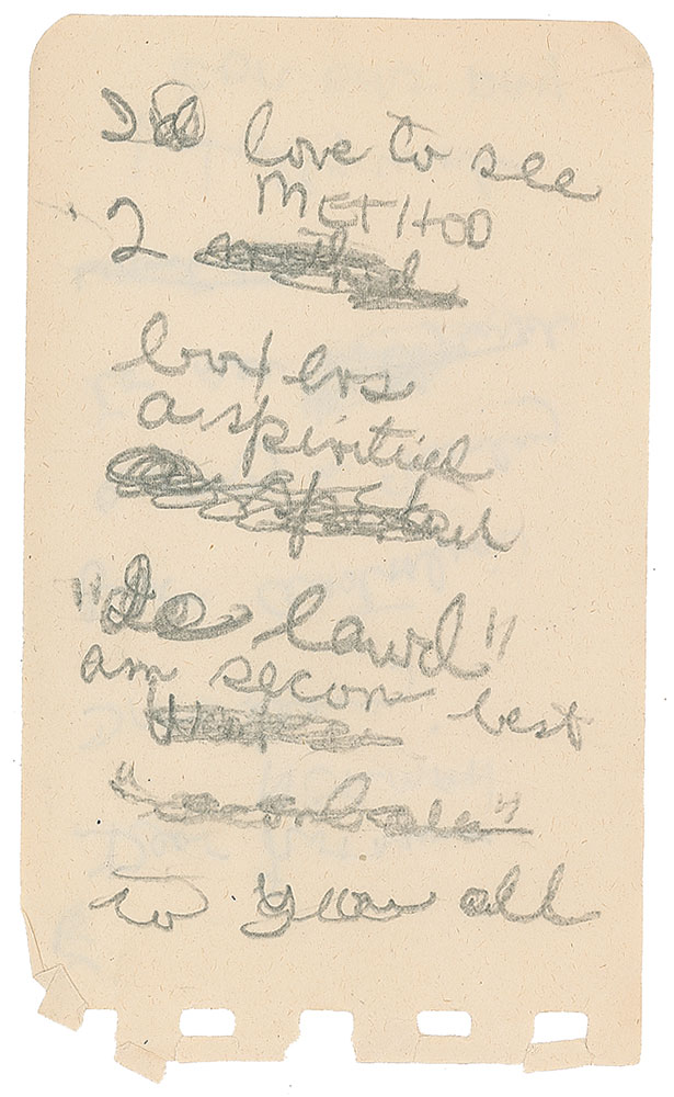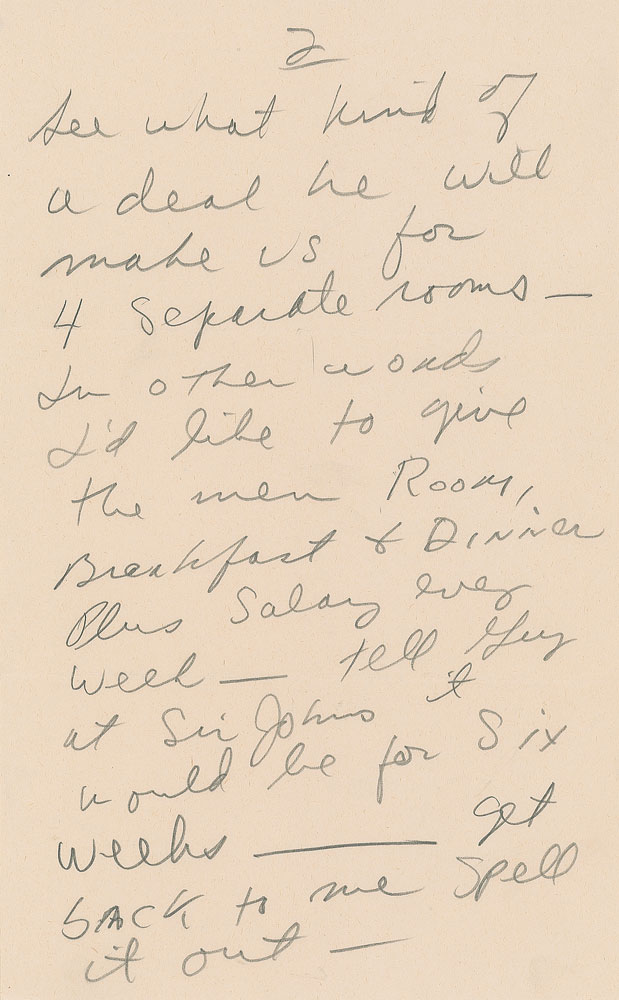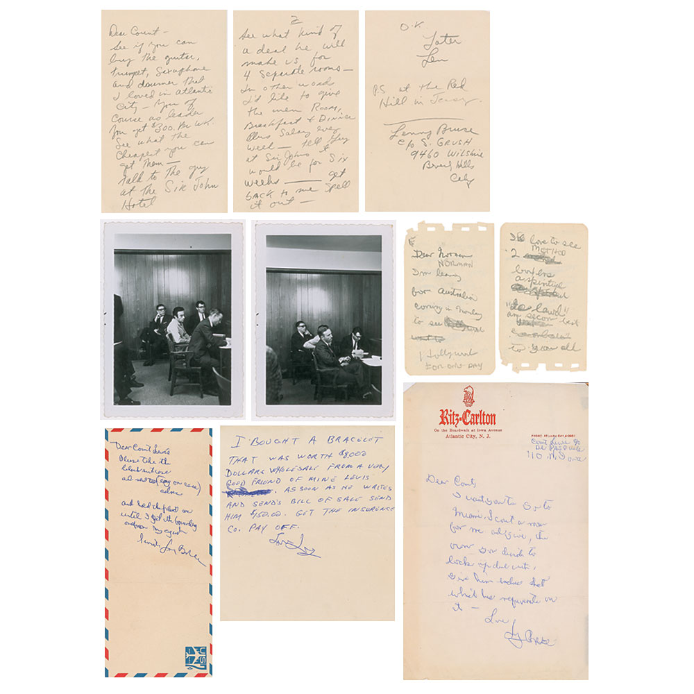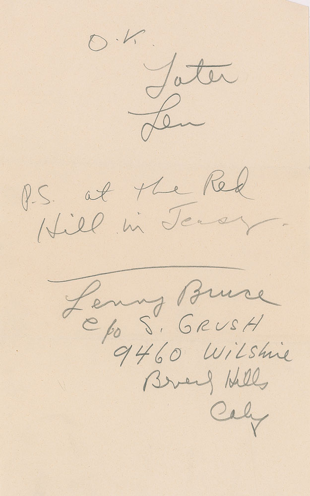 A three-page letter to Count, in part: “See if you can buy the guitar, trumpet, saxophone and drummer that I loved in Atlantic city—you of course as leader you get $300. Per wk. See what the cheapest you can get them—talk to the guy at the Sir John Hotel,” with adding a brief postscript and adding his contact address: “Lenny Bruce, c/o S. Grush, 9460 Wilshire, Beverly Hills, Calif.”