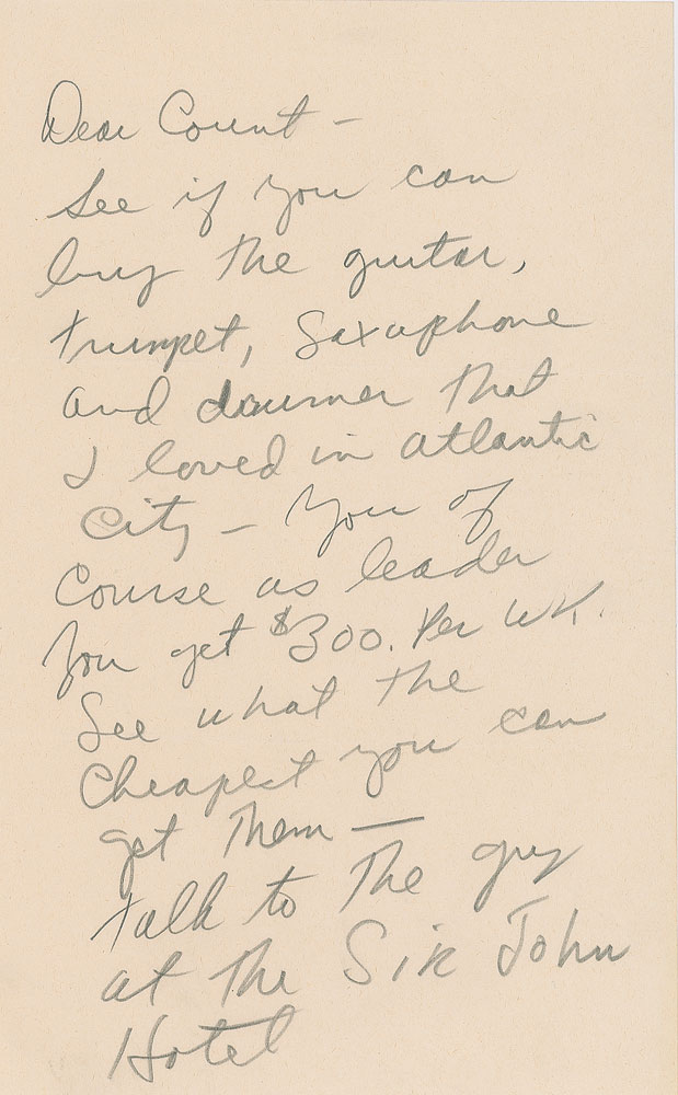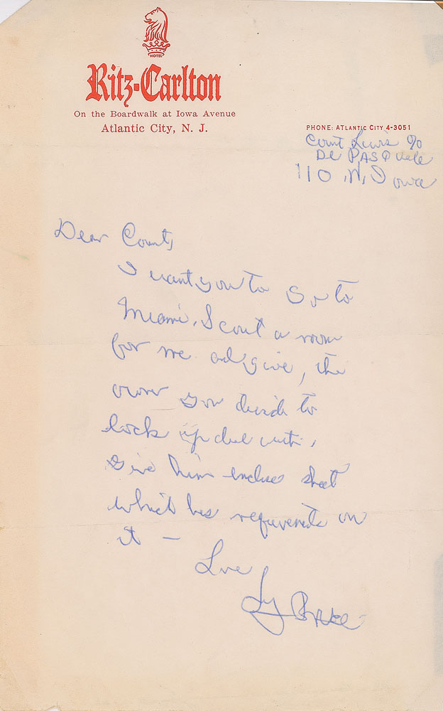 A one-page letter to Count, penned on Ritz-Carlton, Atlantic City stationery, in part: “I want you to go to Miami & rent a room for me?Love, Lenny Bruce.”