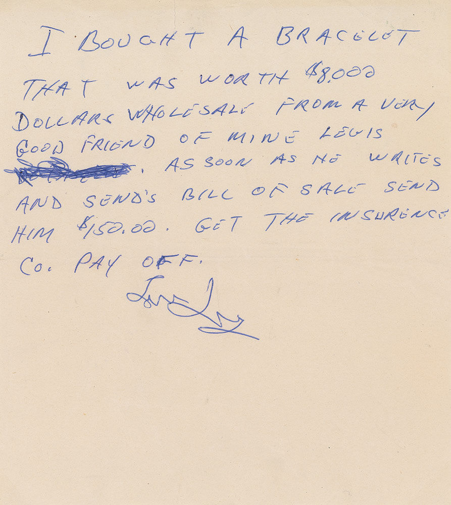 A one-page letter, in part: “I bought a bracelet that was worth $8,000 dollars wholesale from a very good friend of mine Lewis. As soon as he writes and send’s bill of sale send him $150.00. Get the insurance co. pay off. Love, Lenny.”