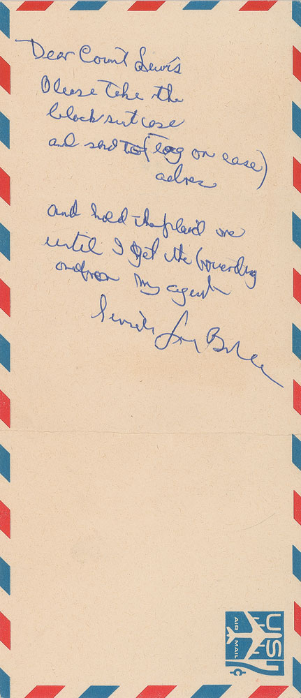 An airmail envelope bearing a handwritten letter to Count, in part: “Please take the black suit case and send to (tag on case) adres and hold the plaid one until I get?one from my agent. Sincerely, Len Bruce.”