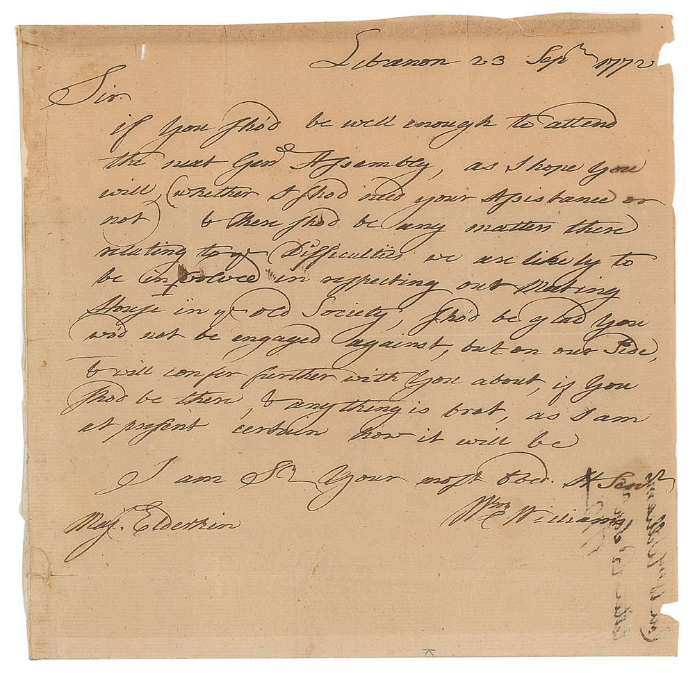 Merchant and signer of the Declaration of Independence from Connecticut (1731-1781). ALS signed “Wm. Williams,” one page, 7.5 x 12.5, September 23, 1772. Written from Lebanon, Connecticut, a letter to Jedediah Elderkin, in part: "If you sho'd be well enough to attend the next Gen' Assembly, as I hope you will (whether I sho'd need your assistance or not) & there sho'd be any matters there relating to yr Difficulties we are likely to be involved in suspecting our Meeting House in yr old Society, sho'd be glad you wo'd not be engaged against, but on our side, & will confer further with you about, if you sho'd be there, & anything is…as I am at present certain now it will be." In very good condition, with light toning and staining, edge tears and chips, and silking behind the seal-related paper loss at the lower left edge. A rare letter from the Connecticut signer—the first example we have ever offered.