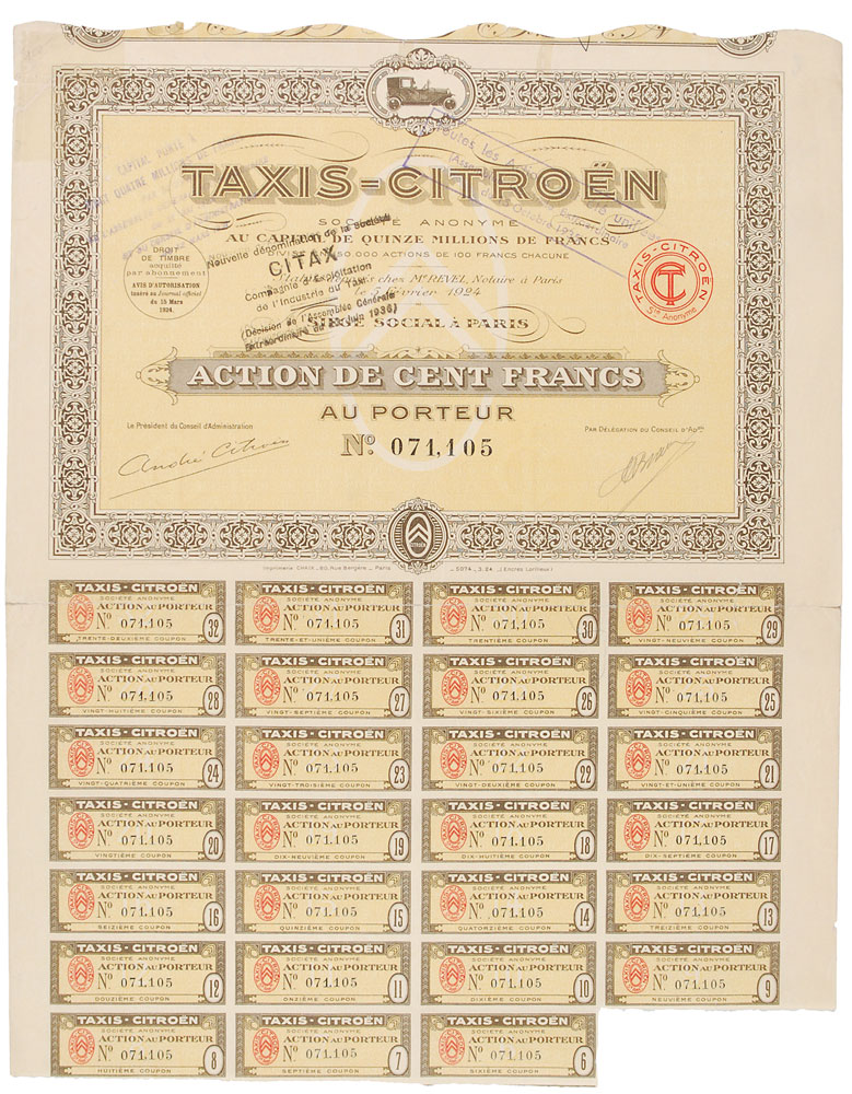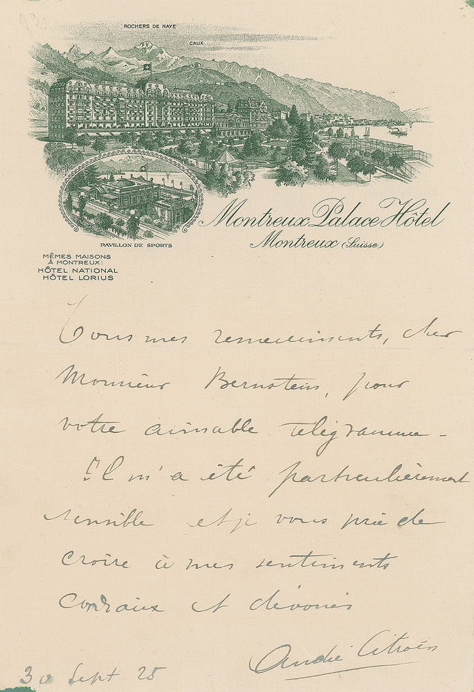 ALS in French, one page, 5.25 x 8, Montreaux Palace Hotel letterhead, September 30, 1925. In full (translated): "All my thanks, dear Mr. Bernstein, for your fine telegram. I was particularly touched by it and I ask you to believe in my cordial and devoted sentiments." In fine condition. Accompanied by a 'Taxis-Citroen' stock certificate bearing Citroen's facsimile signature, issued on February 5, 1924, with 27 coupons still attached.