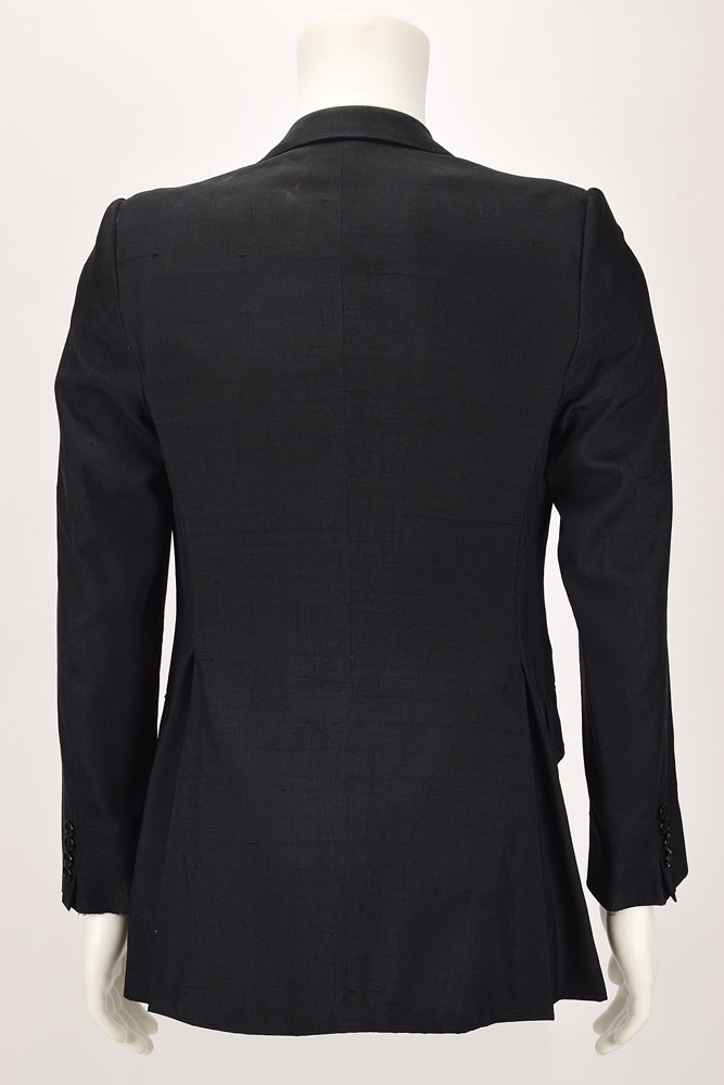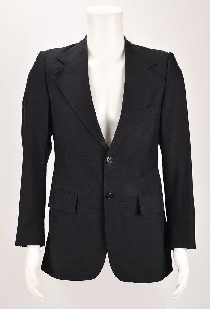 Handsome black blazer personally-owned and -worn by Dee Dee Ramone, the original and longtime bass-player for punk rock legends The Ramones. The two-button single-breasted suit jacket features notched lapels and two front flap pockets, with collar tag indicating that the blazer was made in France. In fine condition. Accompanied by a photo of Dee Dee wearing the blazer as he poses with his wife Vera, and Joey Ramone. From the personal collection of Vera Ramone King.