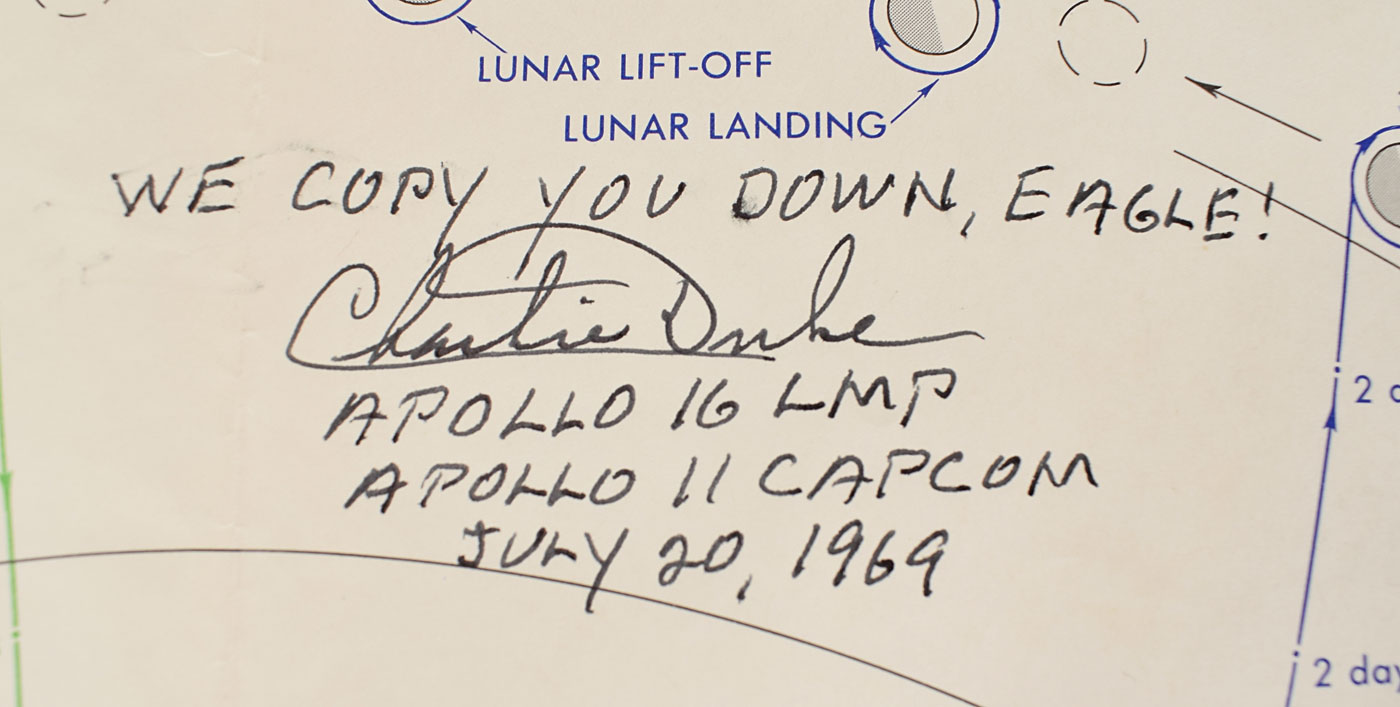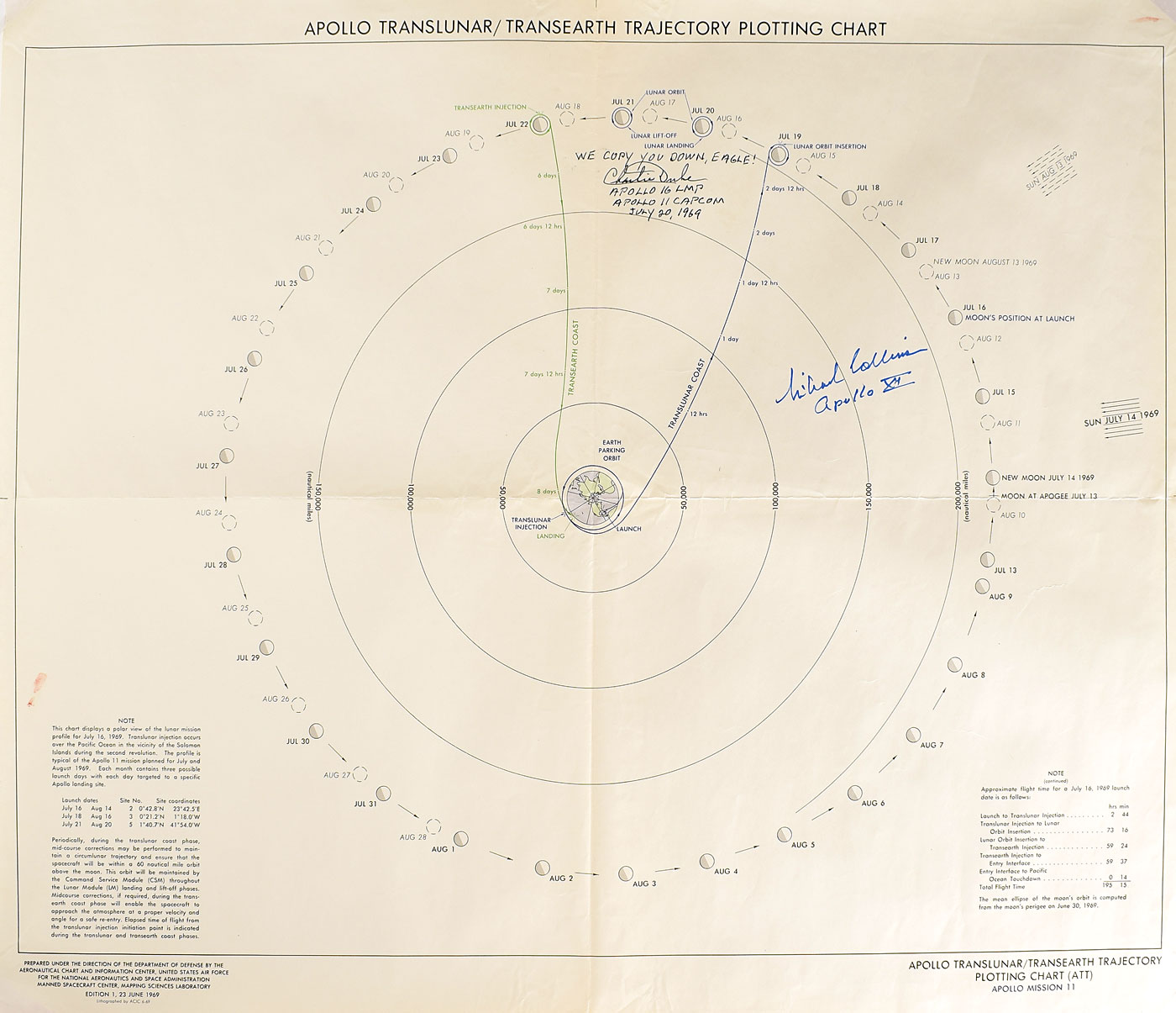 Desirable chart entitled "Apollo Translunar/Transearth Trajectory Plotting Chart (ATT), Apollo Mission 11," 23.75 x 20, depicting a polar view of the lunar mission profile for July 16, 1969, signed in blue felt tip, "Michael Collins, Apollo XI," and in black felt tip, "We copy you down, Eagle! Charlie Duke, Apollo 16 LMP, Apollo 11 CAPCOM, July 20, 1969." Duke's autograph appears at the "Lunar Landing" point on the plotting chart. Rolled and in fine condition, with central vertical and horizontal folds, and scattered creasing and wrinkling.