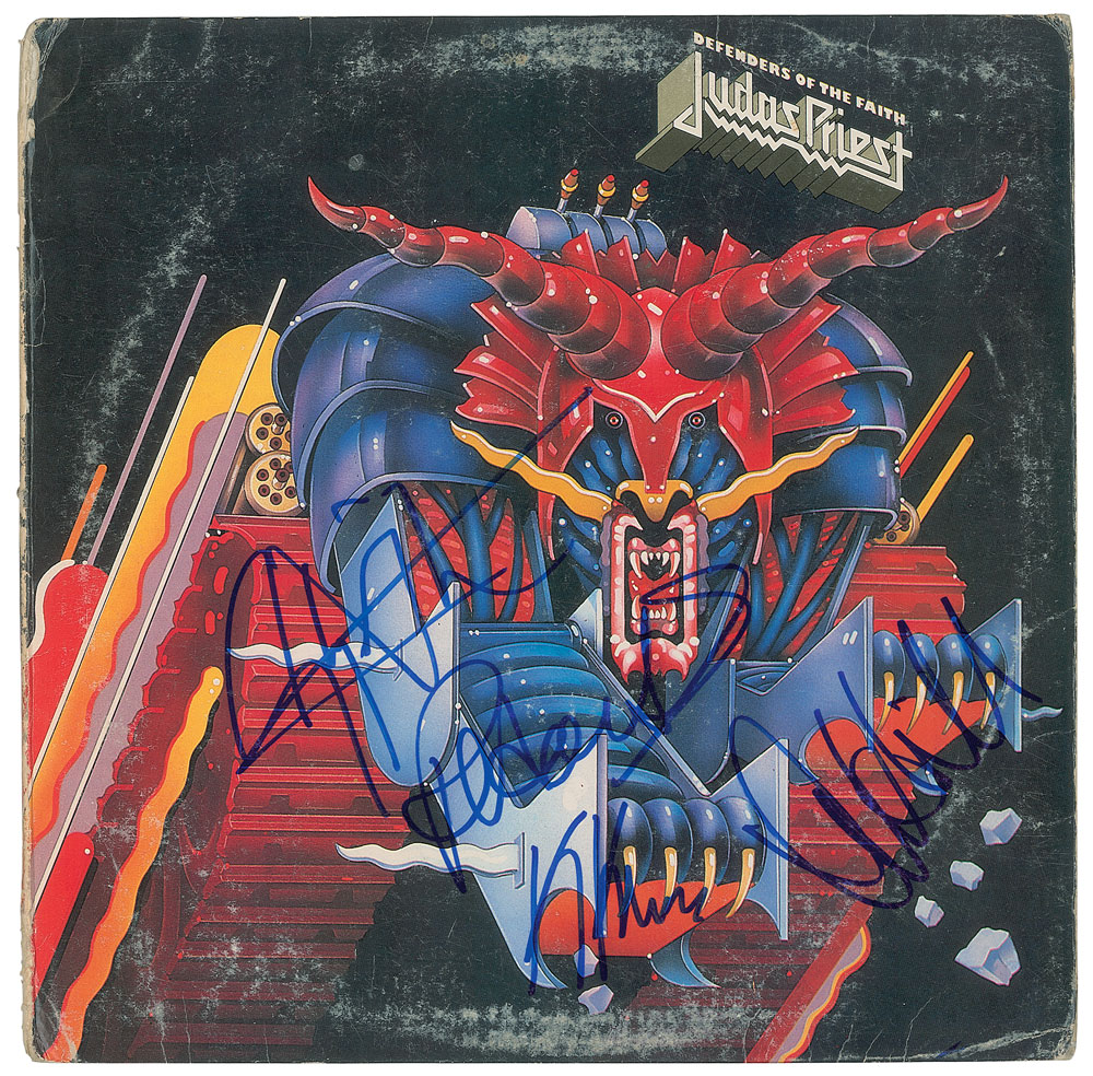 Defenders of the Faith album by Judas Priest, signed on the front cover in blue felt tip by Rob Halford, K. K. Downing, Glenn Tipton, and Ian Hill. In very good condition, with overall scuffing and heavy edge wear. The record is included. From The John Brennan In-person Autograph Collection.