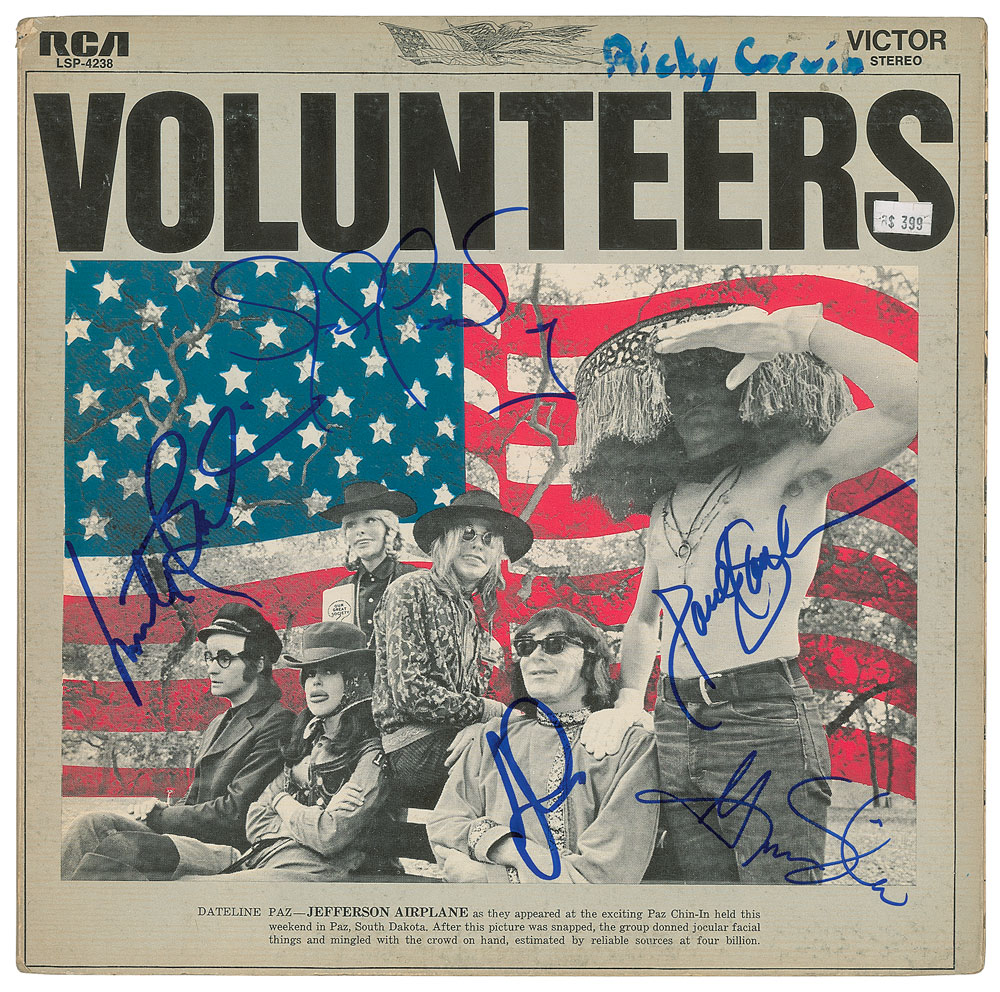 Volunteers album by Jefferson Airplane, signed on the front cover in blue felt tip by Grace Slick, Paul Kantner, Marty Balin, Jorma Kaukonen, and Jack Casady. In very good to fine condition, with an affixed price sticker, and an ownership notation to the top. The record is included. From The John Brennan In-person Autograph Collection.