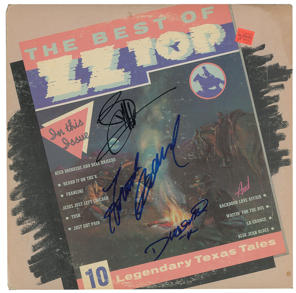 The Best of ZZ Top album signed on the front cover in blue or black felt tip by Dusty Hill, Frank Beard, and Billy Gibbons. In very good to fine condition, with light staining, and an affixed price sticker, to the upper right corner. The record is included. From The John Brennan In-person Autograph Collection.