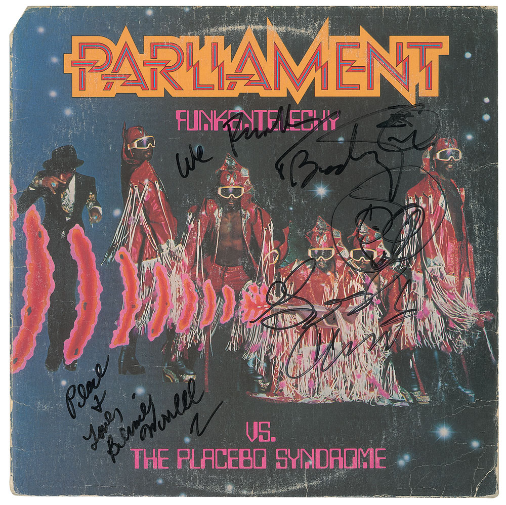 Funkentelechy vs. the Placebo Syndrome album by Parliament, signed on the front cover in black felt tip, "George Clinton," who adds a small sketch, "Peace & Love, Bernie Worrell," and "We funk, Bootsy Collins." In very good condition, with scuffing, corner creasing, and a clipped upper left corner. The record is not included.