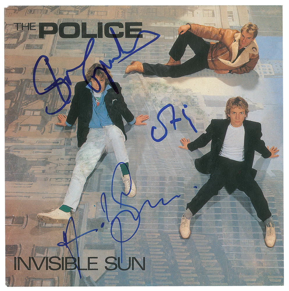 A&M Records 45 RPM record for The Police single 'Invisible Sun / Flexible Strategies,' signed on the front cover in blue felt tip by Stewart Copeland, Andy Summer, and Sting. In fine condition. The record is included. From The John Brennan In-person Autograph Collection.