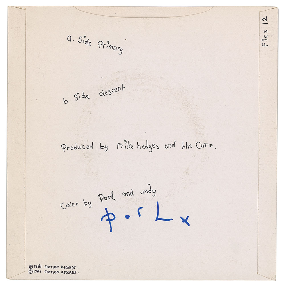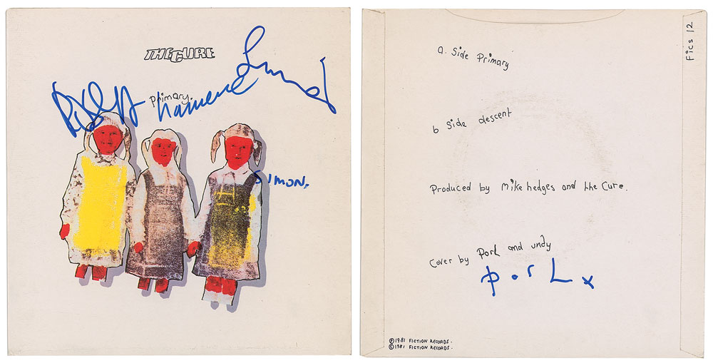 Fiction Records 45 RPM single record for 'Primary / Descent' by The Cure, signed on the front cover in blue felt tip, "Robert," "Simon," and "Laurence," and on the back cover, "Porl." In fine condition. The record is included. From The John Brennan In-person Autograph Collection.