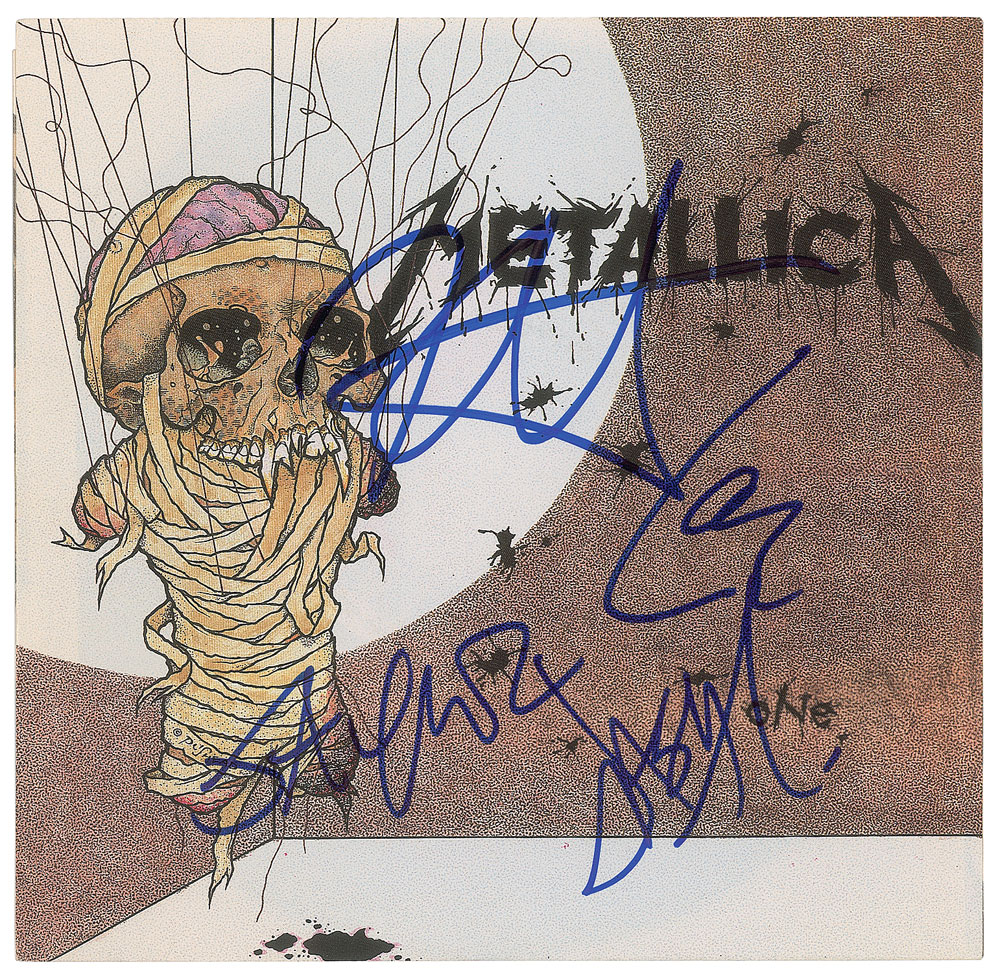 Elektra Records 45 RPM single record for 'One / The Prince' by Metallica, signed on the front cover in blue felt tip by James Hetfield, Lars Ulrich, Kirk Hammett and Jason Newsted. In fine condition. The record is included. From The John Brennan In-person Autograph Collection.