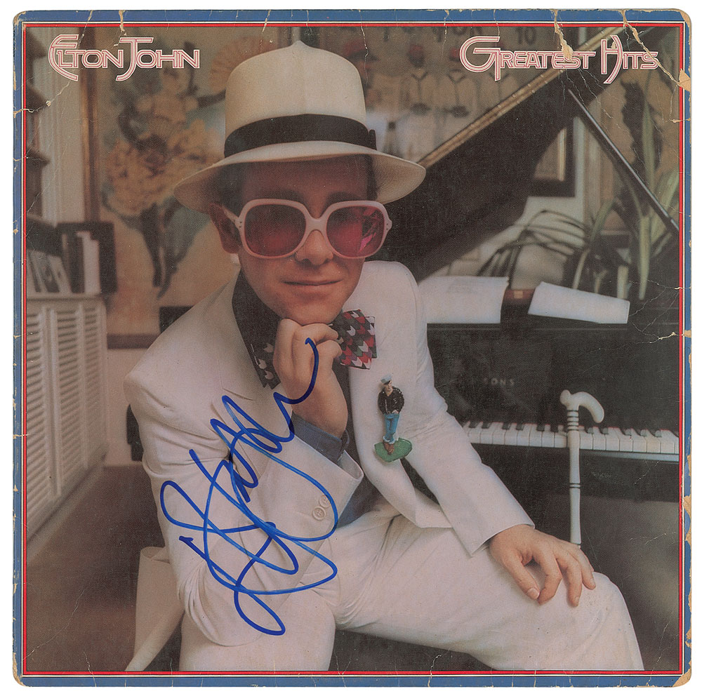 Greatest Hits album by Elton John, signed on the front cover in blue felt tip. In very good condition, with corner creasing (heaviest to the upper right), and edge wear. The record is included. From The John Brennan In-person Autograph Collection.