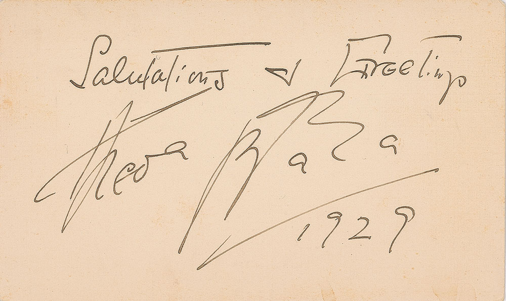 Popular silent actress (1885-1955) famous for her 'vamp' roles and known as one of cinema's first sex symbols. Vintage fountain pen signature, "Salutations & Greetings, Theda Bara, 1929,” on an off-white 5 x 3 card. In fine condition.