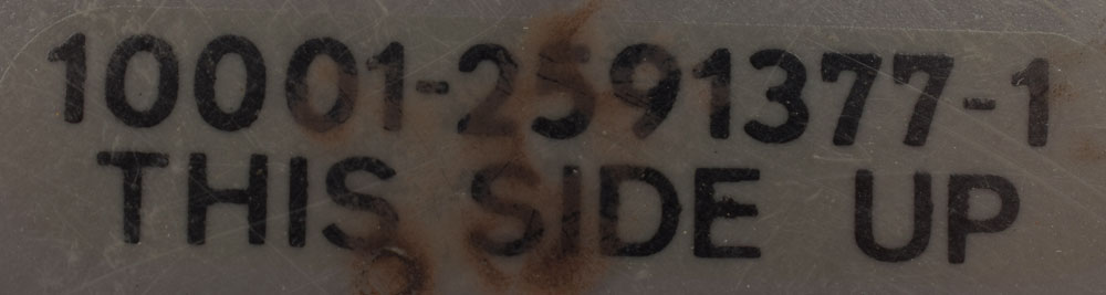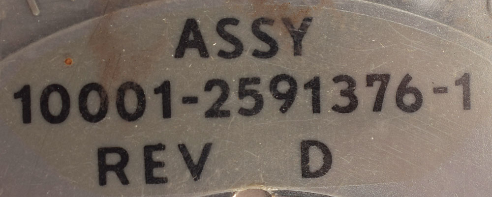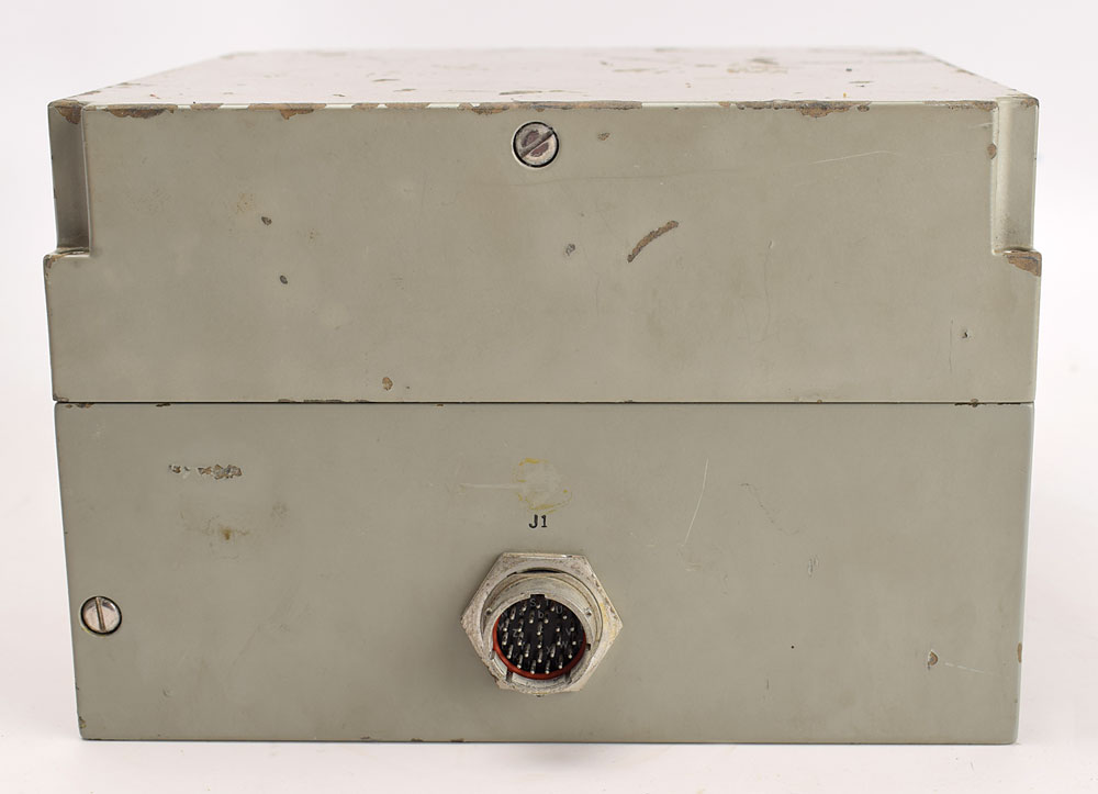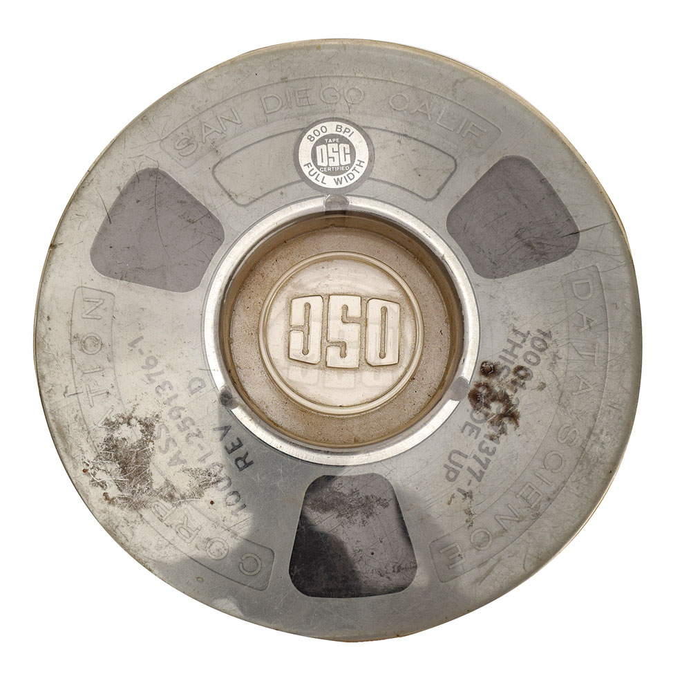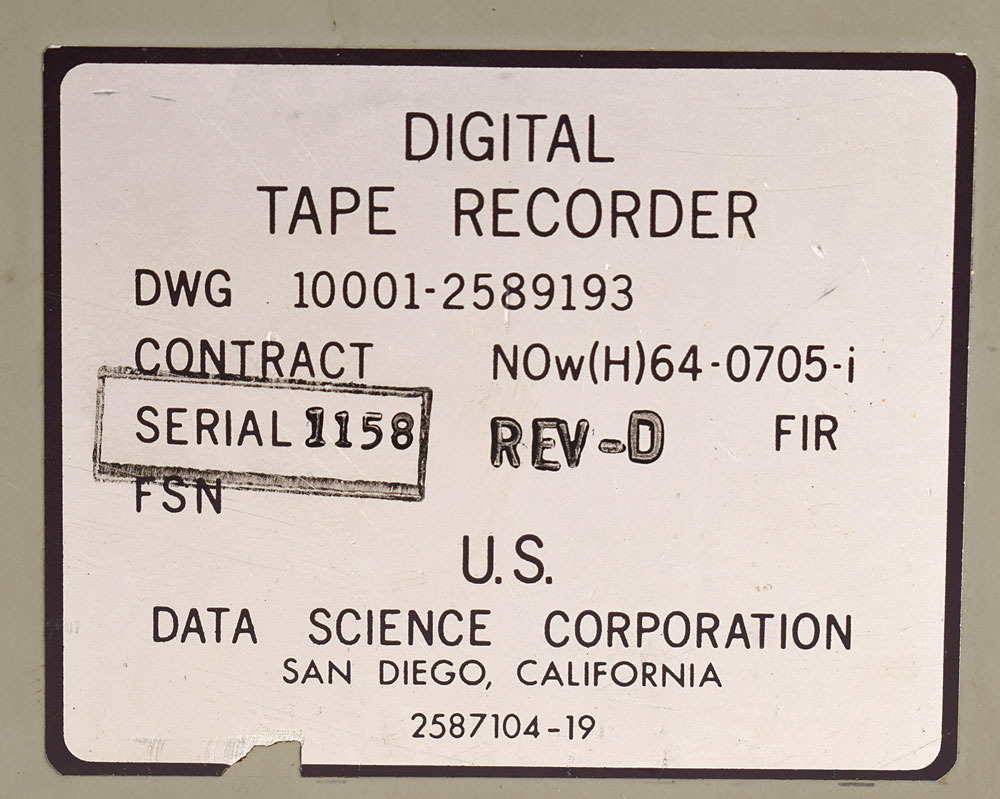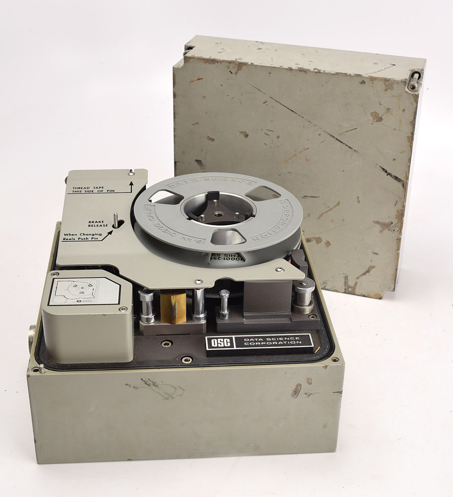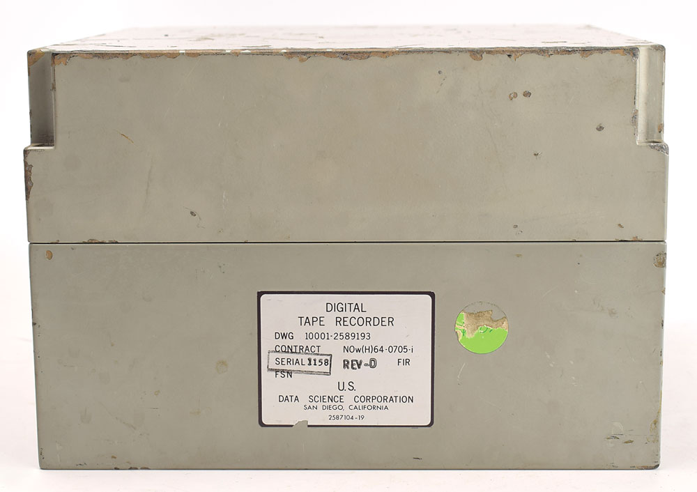 Digital flight tape recorder manufactured by the Data Science Corporation of San Diego, housed in a heavy-duty 9″ x 6″ x 9″ gray metal case, with a label on the front reading: "Digital Tape Recorder, SWG 10001-2589193, Contract NOw(H)64-0705-i, Serial 1158 Rev-D FIR." The top unscrews to reveal the recorder, which has two reels mounted inside (one with tape intact). Includes a spare tape reel, marked: "Assy 10001-2591376-1, Rev D." In fine condition.