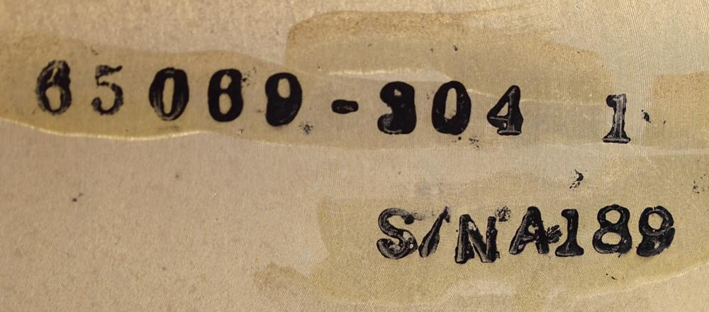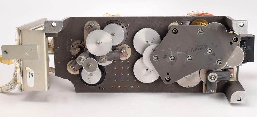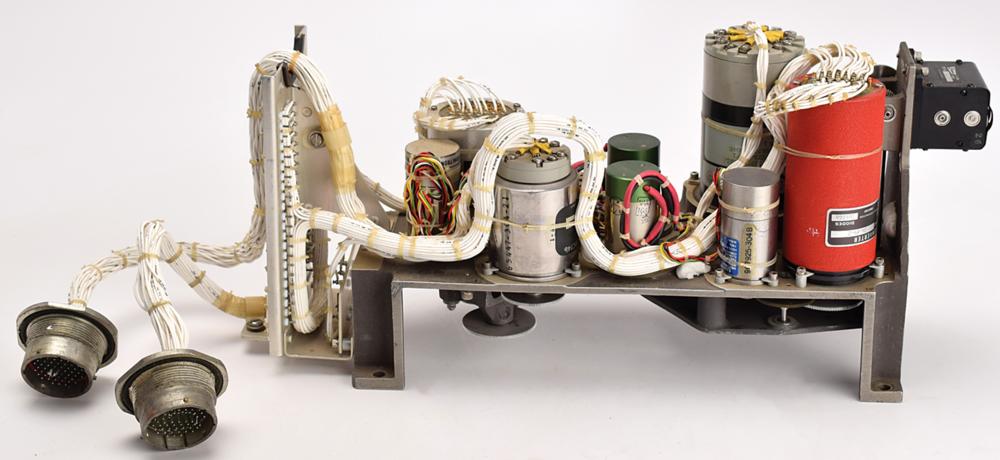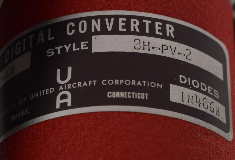 Interesting electromechanical computer module, measuring approximately 14″ x 6.5″ x 3.5″, marked on one side of the metal chassis, "65069-304 1, S/N A189." A mechanical counter is affixed on one end, and the wiring terminates in two Bendix connectors marked "J1" and "J2" on the other end. Components mounted on the unit include a United Aircraft Digital Converter, a Vernitron Resolver, two Solvere Resolvers, and other parts. The underside features numerous interconnecting gears. In very good to fine condition.
