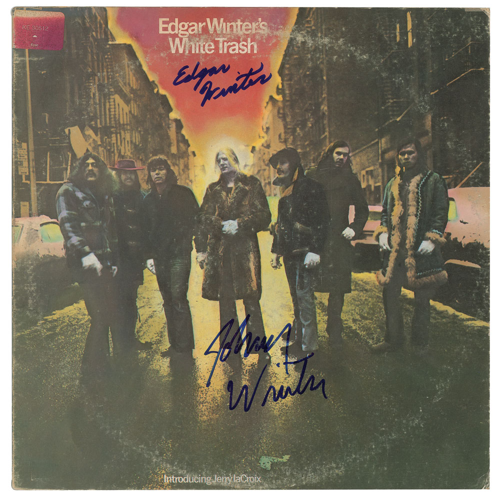 White Trash album by Edgar Winter, signed on the front cover in blue felt tip by Edgar and Johnny Winter. In very good to fine condition, with light scuffing and edge wear. The record is included.