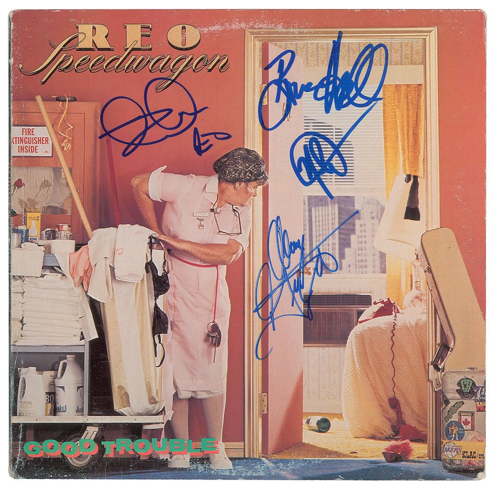 Good Trouble album by REO Speedwagon, signed on the front cover in blue felt tip by Kevin Cronin, Neal Doughty, Bruce Hall, and Alan Gratzer. In fine condition, with light scuffing. The record is not included