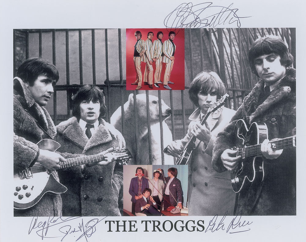 Color satin-finish 10 x 8 composite photo of the Troggs playing in front of a polar bear cage, signed in black ballpoint by Chris Britton, Pete Lucas, Reg Presley, and Pete Staples. In fine condition, with some light creasing.