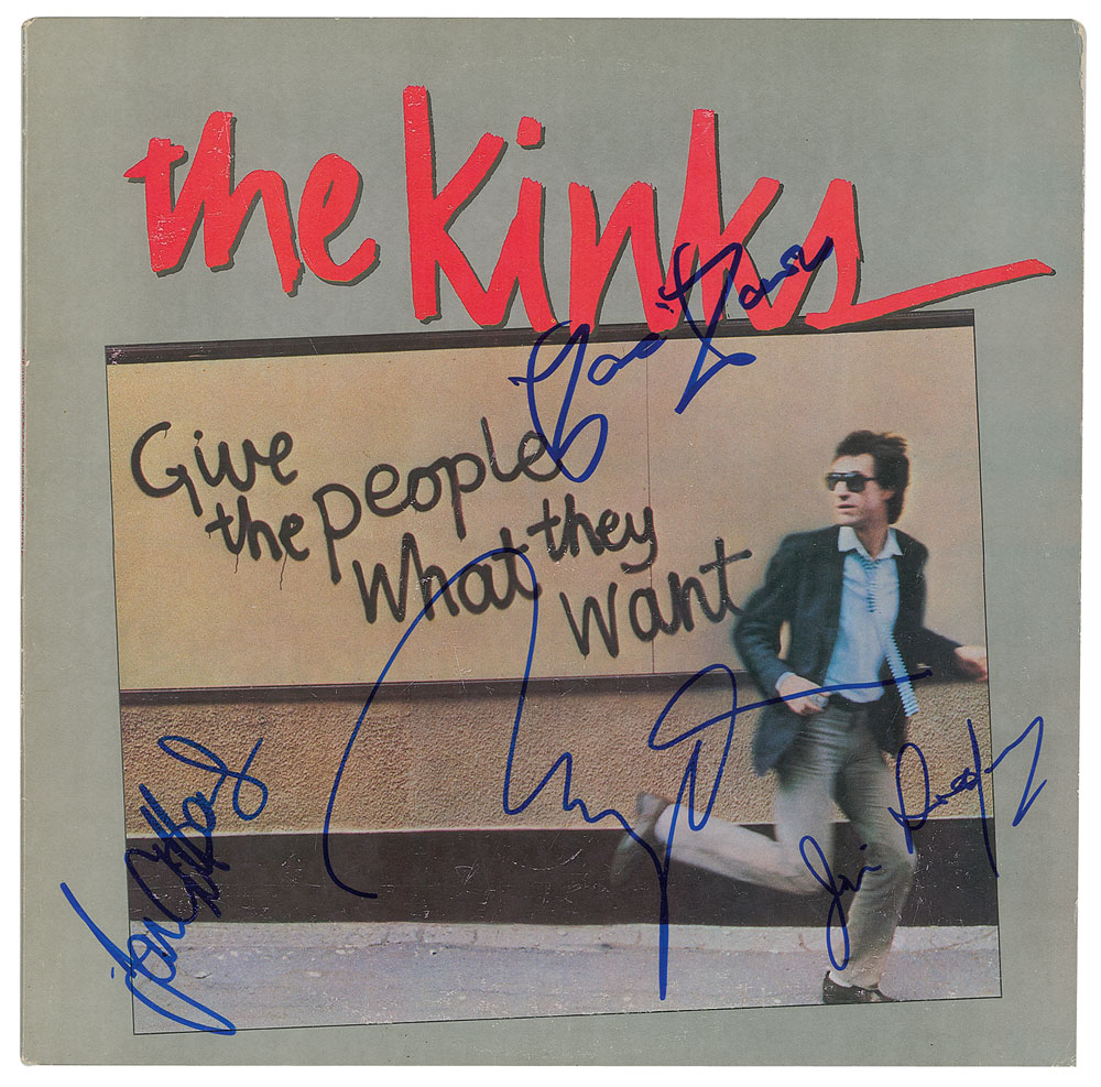 Give the People What They Want album by the Kinks, signed on the front cover in blue felt tip by Ray and Dave Davies, Jim Rodford, and Ian Gibbons. In fine condition. The record is not included.