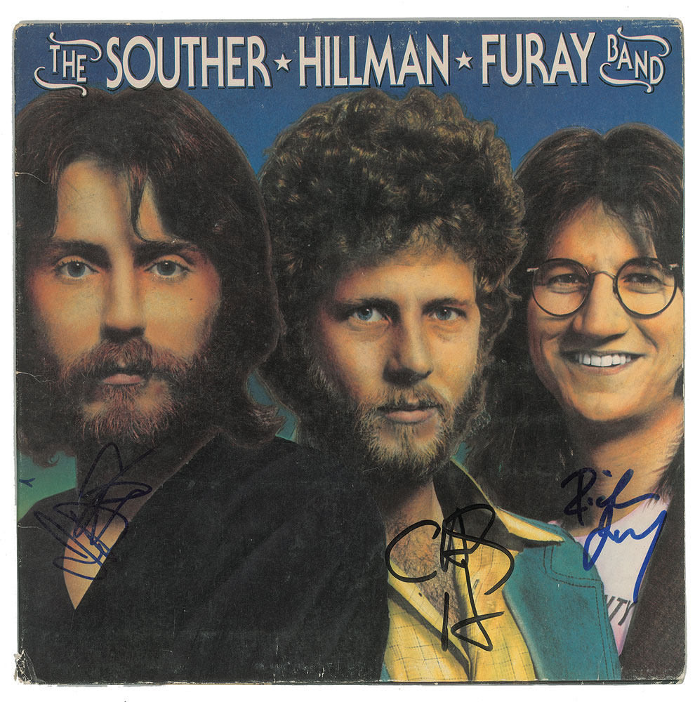 Self-titled debut album by the Souther Hillman Furay Band, signed on the front cover in felt tip by J. D. Souther, Chris Hillman, and Richie Furay. In very good to fine condition, with light scuffing, and an ownership notation on the back cover. The record is not included.