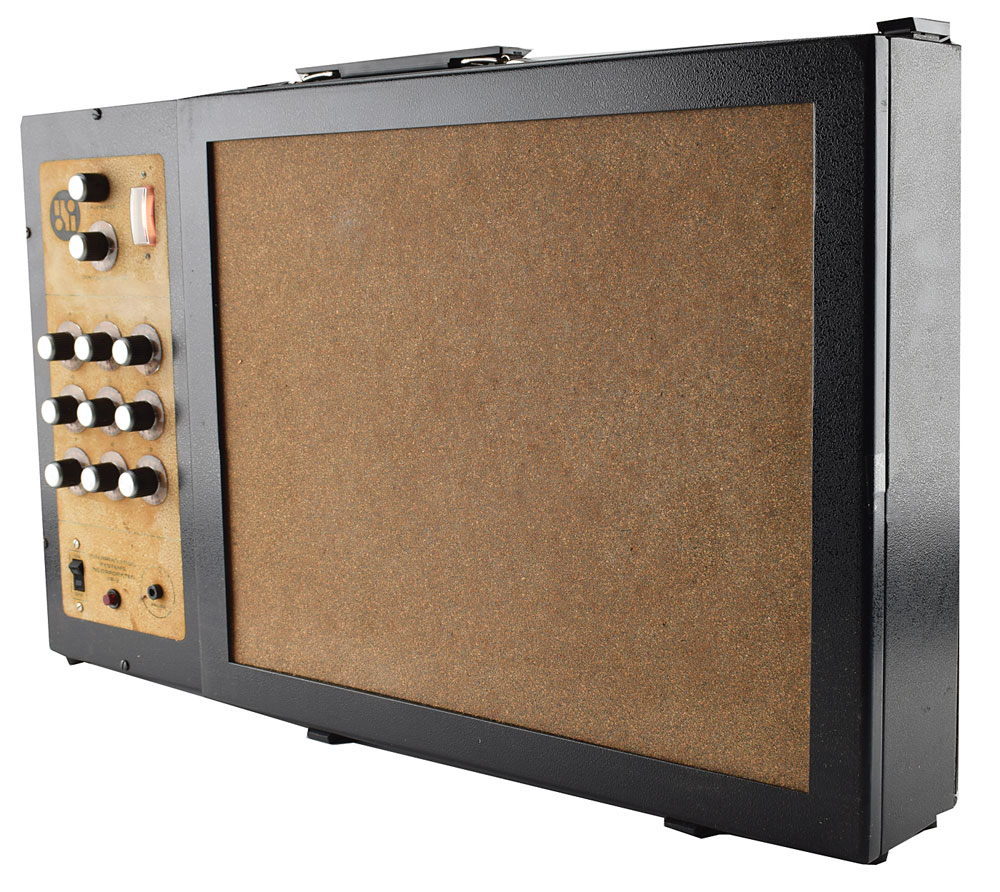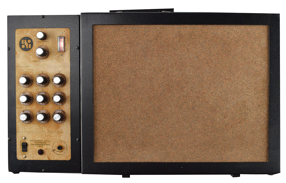 An F-9 field plotter by Interpretation Systems Incorporated, 24 x 14 x 4, with on/off switch, probe input, a block of nine dial knobs, a balance gauge, dial knobs for calibration and contour selection, and large window with cork backing. Upper and lower portions feature pairs of latches, with the lower set opening back panel to reveal interior wiring. Includes the original Interpretation Systems Incorporated shipping box. In very good to fine condition.
