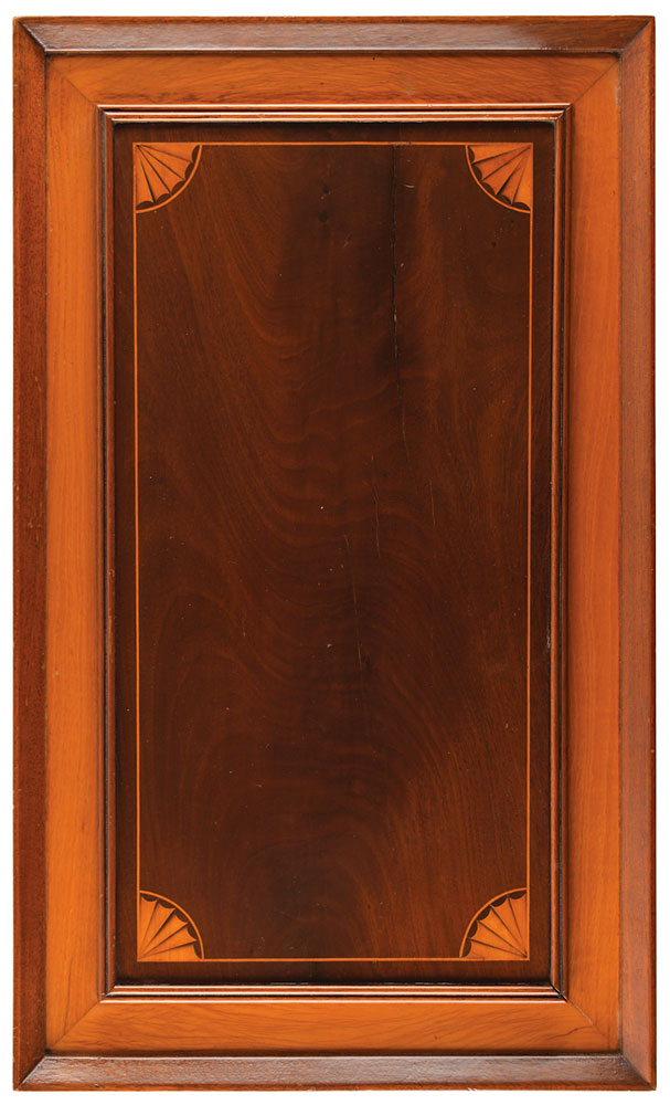 Beautiful original wooden panel removed from the lower part of the 'front door' of the White House on the North Portico as part of its renovation during the Truman administration. The panel was given to James Paul Hauck (commonly known as J. Paul Hauck), who supervised the project while employed by McShain, Inc. Constructed of handsome dark and light wood, the panel measures 16.25″ x 27″ and features scalloped marquetry inlay designs in the corners, bordered by a thin blonde line. It exhibits an 8″ hairline crack to the right side, which is why it was removed from the door to be replicated and replaced. A wire has been attached to the reverse so that it can be displayed in a landscape orientation.