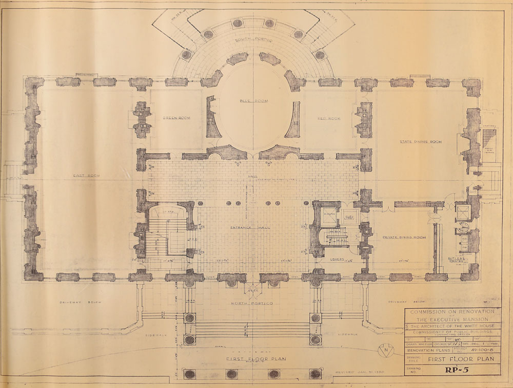 Also includes nine oversized 24″ x 21.5″ pages of renovation plans for the remodel from Hauck's collection, prepared by the "Commission on Renovation of the Executive Mansion," the first eight marked, "Revised, Jan. 31, 1950." The complete floorplans include "Basement Plan," "Basement Mezzanine Plan," "Ground Floor Plan," "Underground Mech. Area (Ground Floor Level)," "First Floor Plan," "Mezzanine Floor Plans, Bet. 1st & 2nd Fl. : Bet. 2nd & 3rd Fl.," "Second Floor Plan," "Third Floor Plan," and "Basement Tunnel Plan."