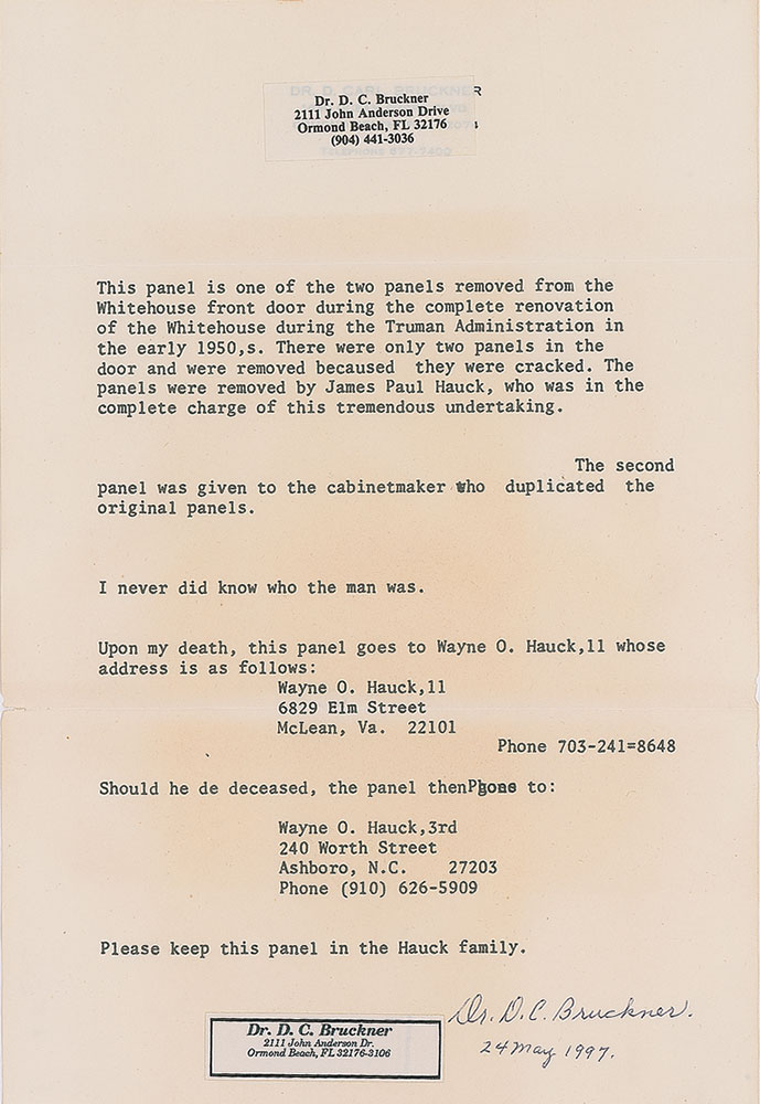 Accompanied by a letter of provenance from Dr. D. C. Bruckner, whose wife was the niece of Beulah 'Bootsie' Hauck, wife of J. Paul Hauck. In part: "This panel is one of the two panels removed from the Whitehouse front door during the complete renovation of the Whitehouse during the Truman Administration in the early 1950s. There were only two panels in the door and were removed because they were cracked. The panels were removed by James Paul Hauck, who was in the complete charge of this tremendous undertaking. The second panel was given to the cabinetmaker who duplicated the original panels." Also includes a photograph of a diagram of the North Portico door provided by the White House Historical Association, photocopied negatives from 1958 showing that the door had been replaced by a glass security door at that time, and a letter from the Library of Congress indicating that they had been unable to locate representative photographs of the North Portico door pre-dating the Truman renovation. An image taken by official White House photographer Pete Souza during the Obama administration shows a very similar panel on an interior door in the White House's Cross Hall.