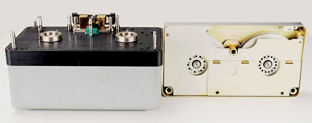 Aircraft flight controller data recorder, measuring 6″ x 11″ x 6″, with a plate on the side reading: "RO-311/AKQ-1, Ser. No. 0007, Pt No Mfr. 94117." The metal cover opens to reveal two empty tape reels and the recording mechanism. In very good to fine condition.