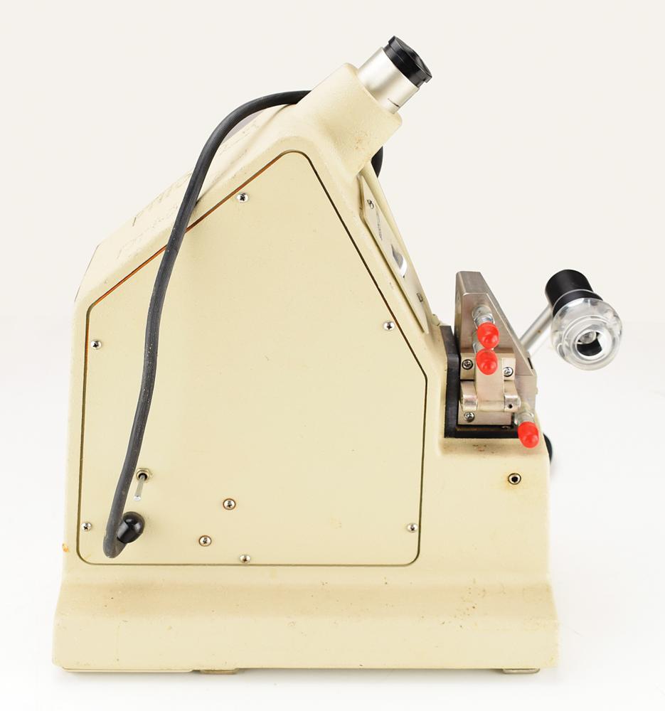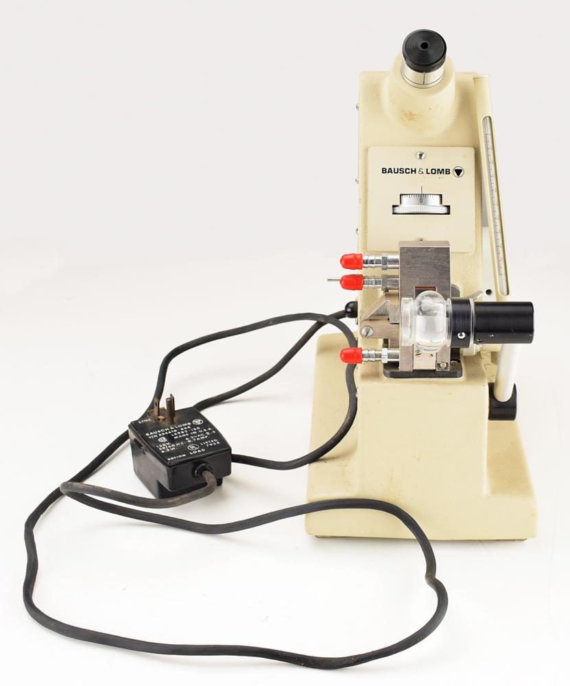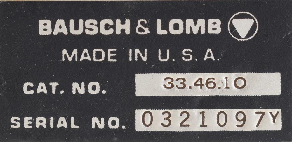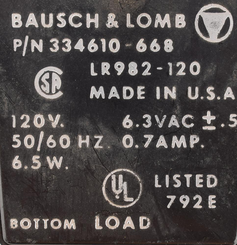 A high precision Abbe 3L optical refractometer manufactured by Bausch & Lomb, 6″ x 12.75″ x 10.5″, consisting of upper eyepiece, thermometer, compensation dial, adjustment wheel, on/off scale display switch, illuminator arm with lamp, and assembly with measuring and illuminating prism. Manufacturing plate to reverse reads: "Cat. No. 33.46.10, Serial No. 0321097Y." Felt tip notations to frame are as follows: "PTHO724" and "99028436." Power cord terminates in three-prong plug, which is marked: "Bausch & Lomb, P/N 334610-668, LR982-120…120V., 6.3VAC…50/60 HZ, 0.7 AMO, 6.5 W, Listed 792 E." In very good to fine condition.