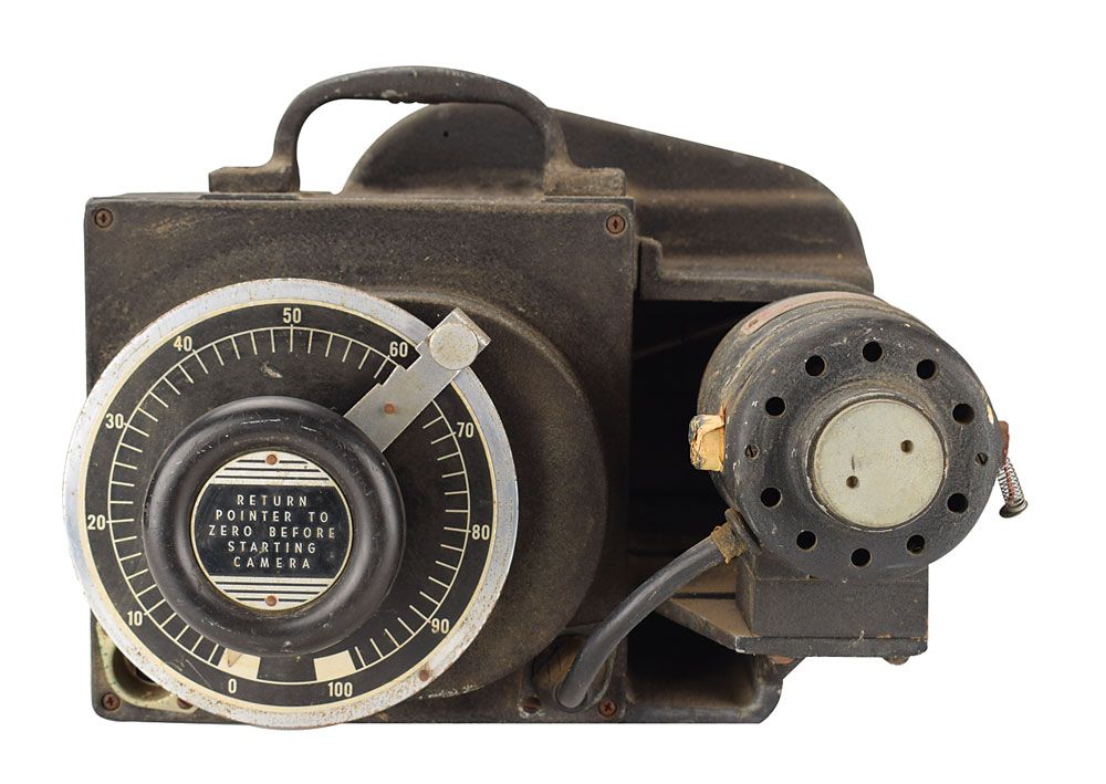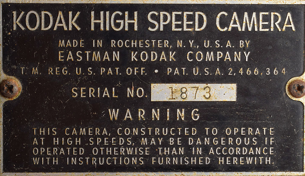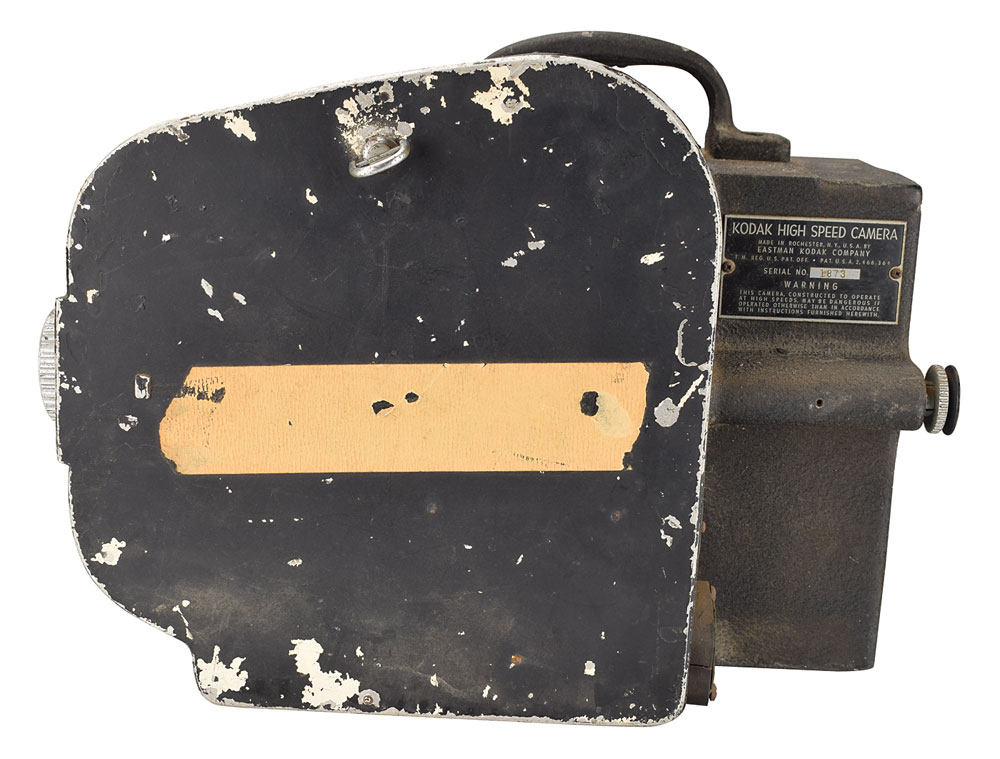Vintage Kodak High Speed Camera, measuring 12.5″ x 12″ x 9″, with a plate on the rear, reading: "Kodak High Speed Camera, Made in Rochester, N.Y., U.S.A. by Eastman Kodak Company?Serial No. 1873." The movie camera used 16mm film and is constructed from heavy cast aluminum. In very good condition, with soiling to exterior and the lens missing.