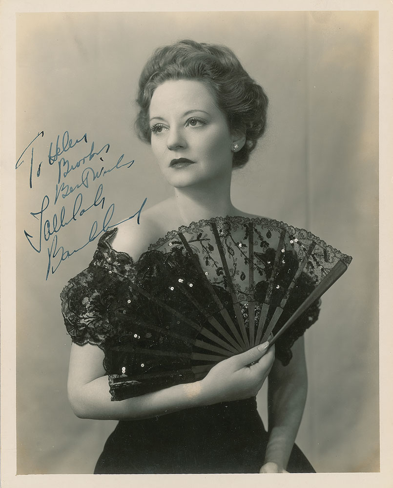 Gorgeous vintage pearl-finish 8 x 10 photo of Bankhead holding a beaded fan, signed and inscribed in fountain pen, "To Helen Brooks, Best Wishes, Tallulah Bankhead.” Reverse bears a Vandamm Studio credit stamp. In fine condition, with light bends to the corners, and light silvering along the bottom edge.