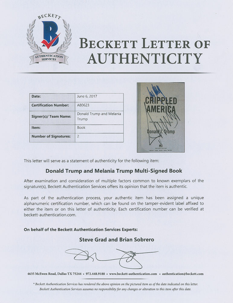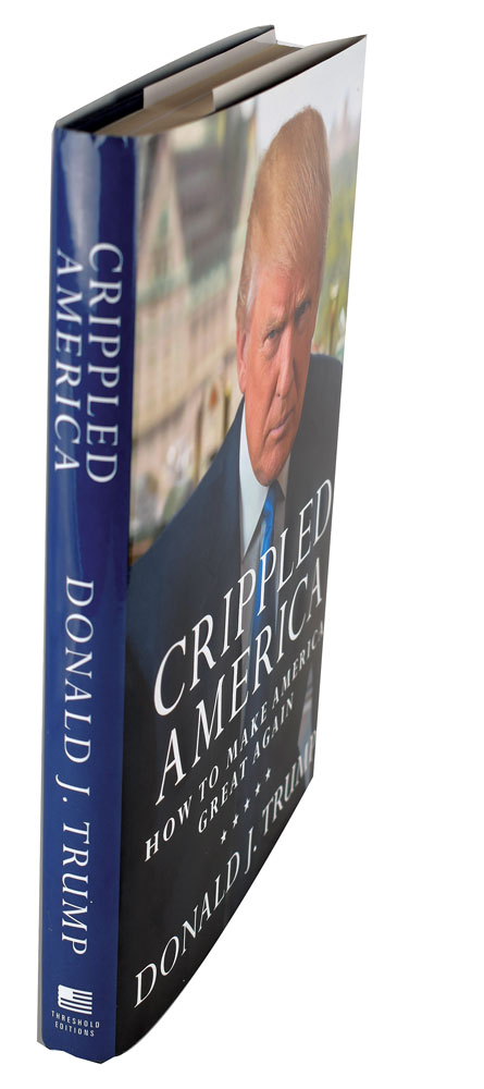 Rare signed book: Crippled America. First edition. NY: Threshold Editions, 2015. Hardcover with dust jacket, 5.75 x 8.75, 193 pages. Signed on the title page in black felt tip by Donald Trump and in blue felt tip by Melania Trump. In fine condition, with a Beckett label affixed to the signed page. A rare volume signed by both the president and first lady. Accompanied by a full letter of authenticity from Beckett Authentication Services.