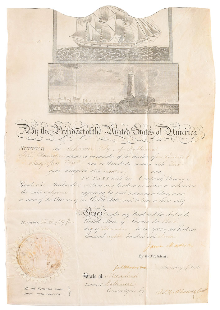 Partly-printed vellum DS, signed “James Madison" as president and "Jas. Monroe" as secretary of state,” one page, 10.5 x 15.75, December 3, 1811. Scallop-topped ship’s pass issued for the "Schooner Fly of Baltimore, John Damer master or commander?mounted with Two guns, navigated with nineteen men, To Pass with her Company, Passengers, Goods and Merchandize without any hinderance, seizure or molestation, the said Schooner appearing by good testimony to belong to one or more of the Citizens of the United States." Signed at the conclusion by President James Madison and countersigned by Secretary of State James Monroe. The crisp white paper seal affixed to the lower left remains intact. In fine condition, with a tiny triangular hole to the left of the top vignette.