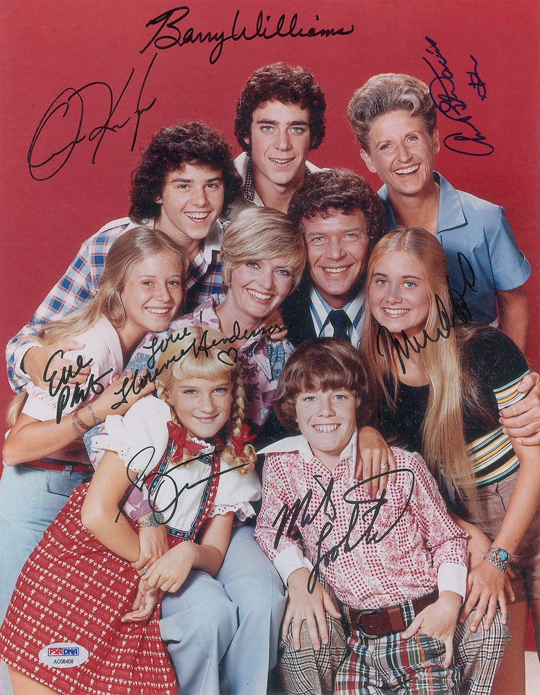 Color glossy 11 x 14 photo of the Brady Bunch cast, signed in black felt tip by Christopher Knight, Barry Williams, Ann B. Davis, Florence Henderson, Eve Plumb, Maureen McCormick, Susan Olsen, and Mike Lookinland. In fine condition, with a PSA/DNA label affixed to lower left corner. Accompanied by a full letter of authenticity from PSA/DNA.