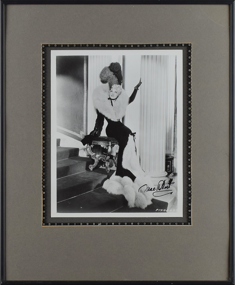 Glossy 8 x 10 full-length photo of West in an elaborate costume at the foot of an elegant staircase, signed in black felt tip. Mounted, matted, and framed to an overall size of 14 x 17. In fine condition.