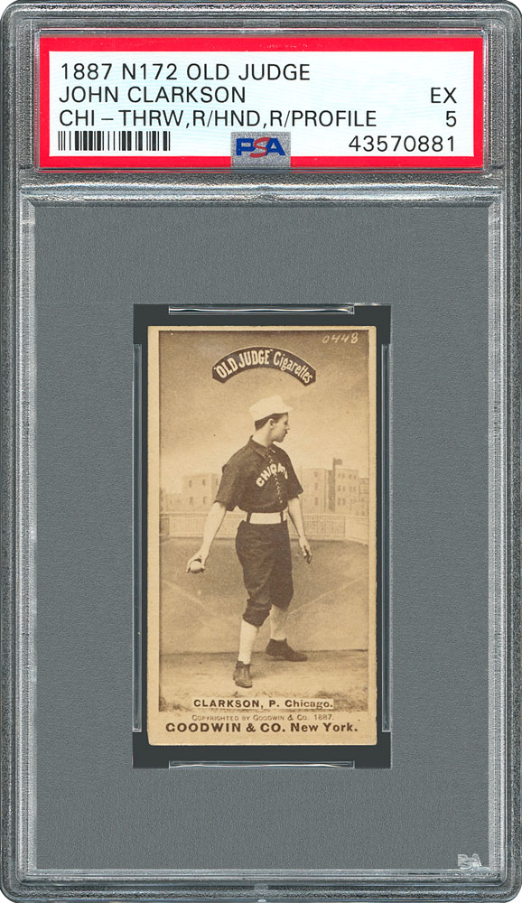 Graded by PSA EX 5. Very eye-appealing example, the highest graded PSA copy extant according to their population report for this pose. Superb image of the Hall of Fame pitcher, crisp with tremendous clarity, which is accented by four square (if not sharp) corners. The image is centered a touch to the right, with absolutely no tilt or mis-cuts, which so often occur within this issue. A perfectly clean reverse completes the package. Of the seven Clarkson cards within the N172 Old Judge set, this is arguably his most difficult to find pose. Graded by PSA EX 5, the highest PSA graded example.