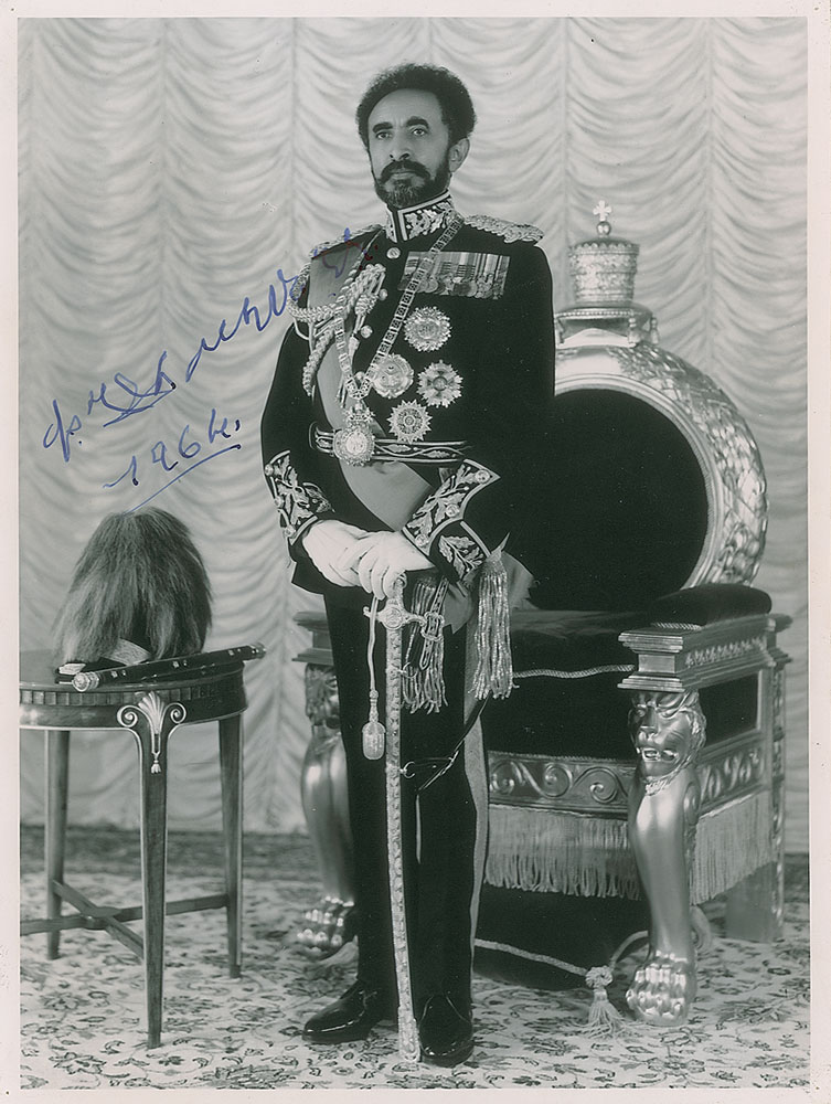Vintage matte-finish 7 x 9.5 royal portrait of the Ethiopian emperor standing in his military uniform, signed in fountain pen, "Haile Selassie, 1964." Reverse bears a stamp for Tony Boyadjian, the court photographer of Addis Ababa. In fine to very fine condition, with light edge rippling, and a pin hole to each corner. A sensational photo of Selassie in a noble full-length pose, signed in his final year as the first chairman of the Organization of African Unity.