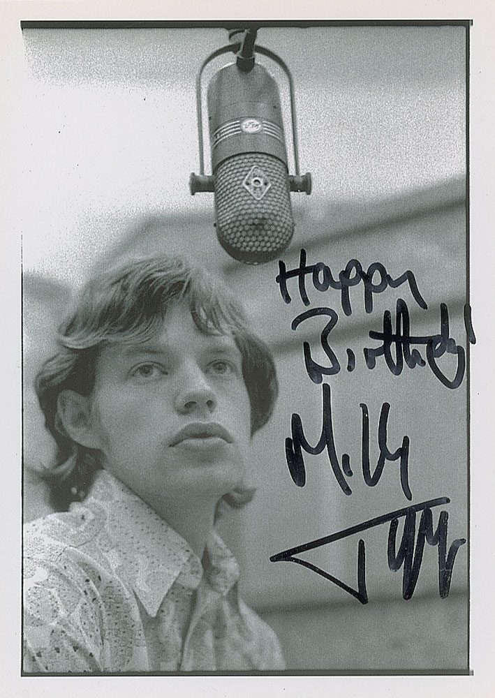 Glossy 4.25 x 5.75 postcard photo of the Rolling Stones frontman under a microphone at Olympic Studios in 1966, signed in black felt tip, "Happy Birthday, Mick Jagger." In fine condition. Accompanied by a letter of provenance from the original recipient, in part: "Mick Jagger signed the art postcard at the 606 Club in Chelsea, London, on 6 September 2011. Mick was at the club to watch Charlie Watts. Mick Jagger added 'Happy Birthday' after learning one of our group was celebrating his birthday. I obtained the signature myself."