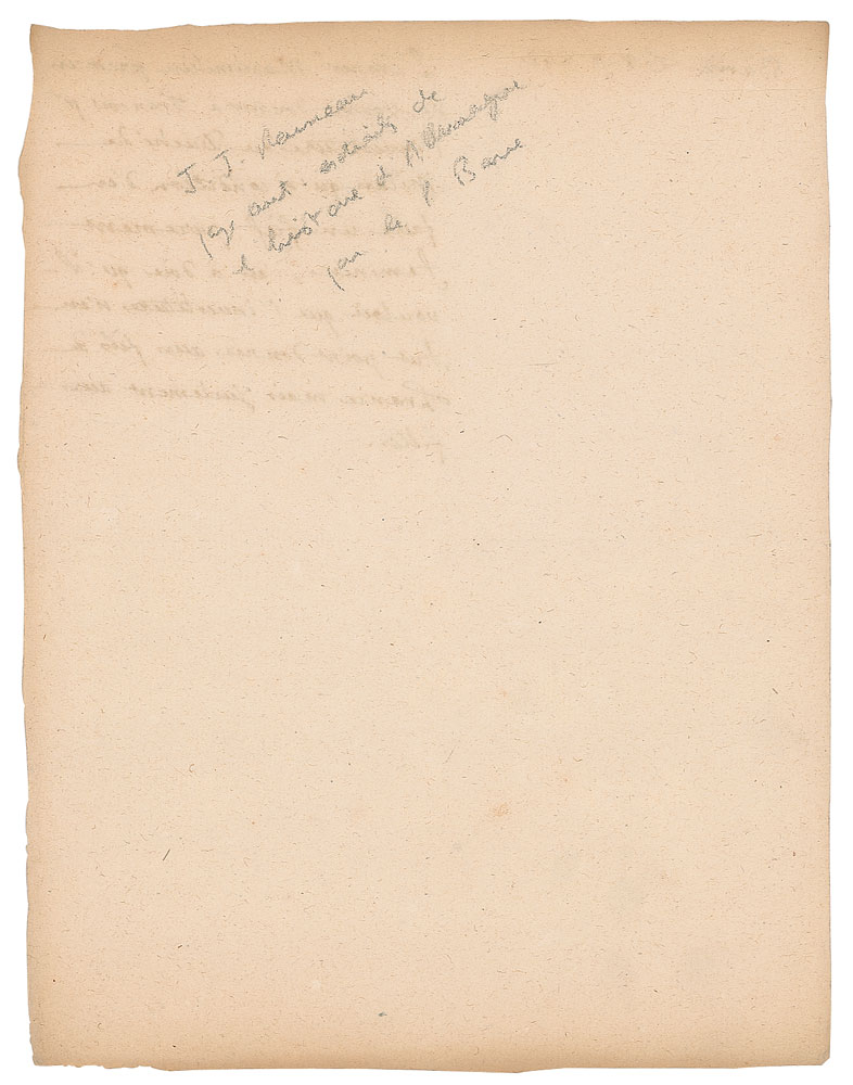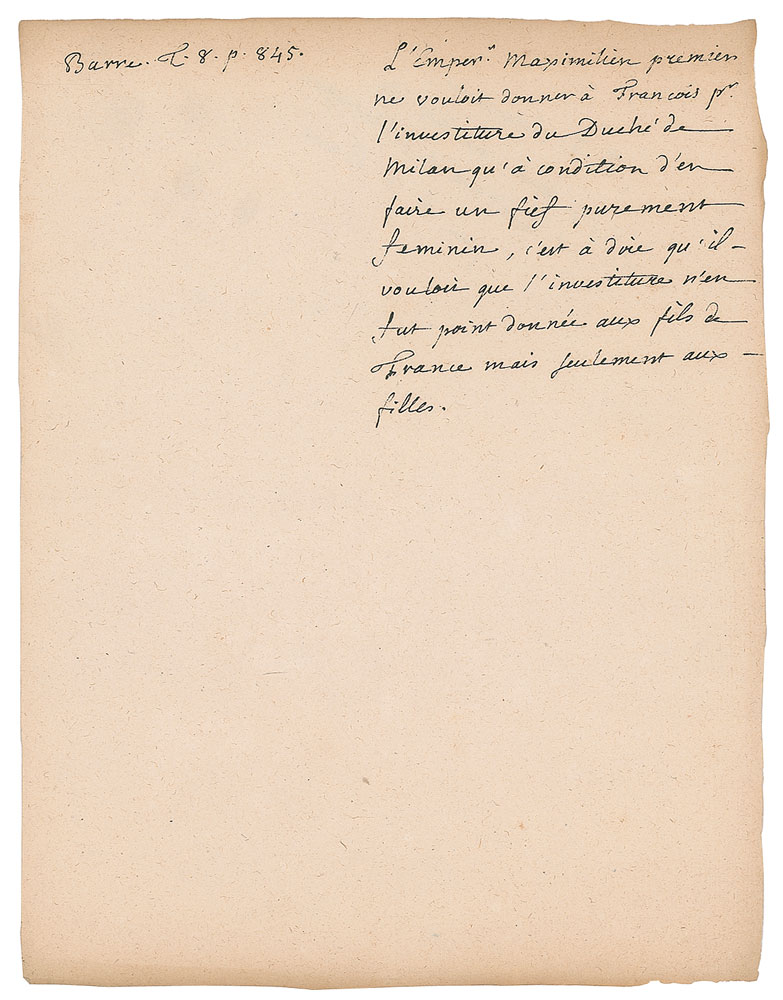 Important Swiss-French philosopher and writer (1712-1778) who held that the individual is essentially good but usually corrupted by society. Rare autograph manuscript in French, unsigned, no date, penned boldly by Jean-Jacques Rousseau on an off-white 7.75 x 10 sheet. The page derives from his unpublished work relating to the history of women which he prepared between 1746-51 for his benefactress Louise Marie Madeleine Dupin. Rousseau writes his text in the right column of the page, with the left reserved for additional notes. In full (translated): “The Emperor Maximilian the First wanted to give to Francis the First the investiture of the Duchy of Milan only on the condition that he makes of it a purely feminine fief, that is to say he wanted that the investiture would not be given to the sons of France but only to the daughters.” In the upper left corner Rousseau has added “Barre L. 8. p. 845.” In fine condition.