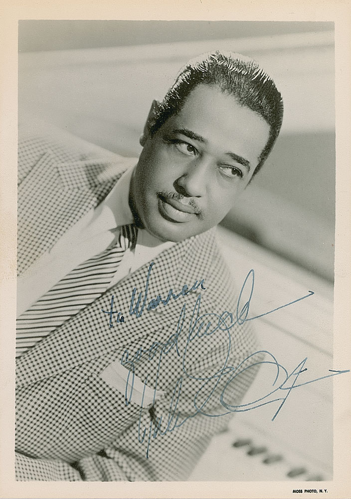 Vintage matte-finish 5 x 7 photo of the suave band leader by the Moss Studio of New York, signed and inscribed in fountain pen, "To Warren, good luck, Duke Ellington.” In very fine condition.