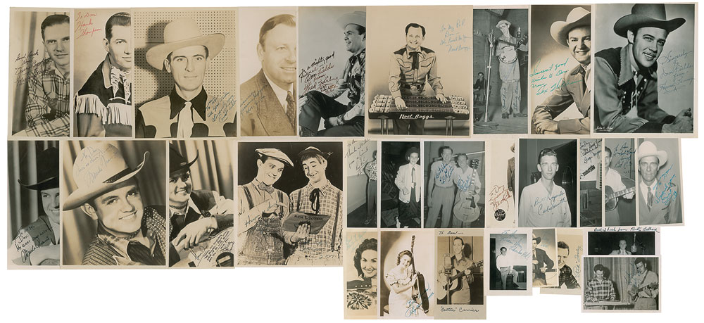Impressive collection of 29 vintage photos, ranging in size from 3.5 x 4.75 to 8 x 10.25, each signed by one or more notable country music legends, with many inscribed to “Don,” including: David ‘Stringbean’ Akeman and Lew Childre; Noel Boggs; Johnny Bond; Phyllis Brown; Jerry Byrd; Cotton Carrier; Don Davis; Jimmie Davis; Little Jimmy Dickens; Bob Eaton; Red Foley; Bob Foster and Hank Garland; Rusty Gabbard; Fred Kirby; Eddie Kirk; Laura Lee; Lonzo and Oscar; Grady Martin; George Morgan; Hank Penny; ; Ray Price; Carl Smith; Hank Thompson; Merle Travis (3); Ernest Tubb (2); and Tex Williams. In overall very good to fine condition. Accompanied by several vintage unsigned photos of country musicians like Goldie Hill, Charline Arthur, Noel Boggs, the Carter family, Earl Scruggs, Lefty Frizzell, and more.
