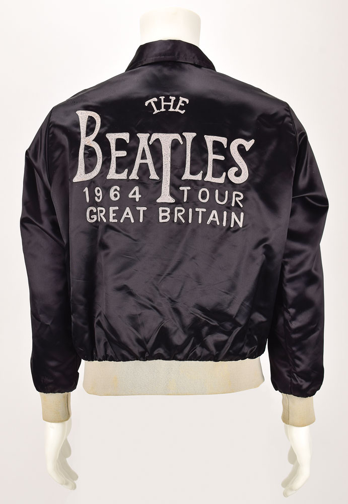 Original snap-front Beatles 'fantasy' tour jacket, size medium, featuring a black nylon satin outer shell, gray polyester inner lining, and gray rib-knit wrist and waist bands; the back of the jacket is embroidered in gray thread: "The Beatles, 1964 Tour, Great Britain." These jackets were made in the early 1970s and advertised for sale in the back of music magazines. Nearly half a century old, this jacket is in excellent overall condition, with a couple loose threads and light stains to gray rib-knit sections.