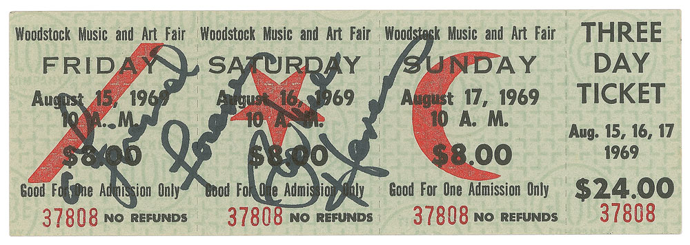 Choice original unused 6 x 2 three-day admission ticket for the iconic Woodstock Music and Art Fair, issued for August 15-17, 1969, signed in black felt tip, "A friend forever, Richie Havens." Each ticket is numbered "37808," and marked with a face value of $8.00, for a total cost of $24.00. In fine condition. Havens was the first performer at Woodstock, and with many other scheduled acts delayed due to standstill traffic, Havens captivated the crowd for nearly three hours. The release of the subsequent Woodstock movie made Havens a household name.