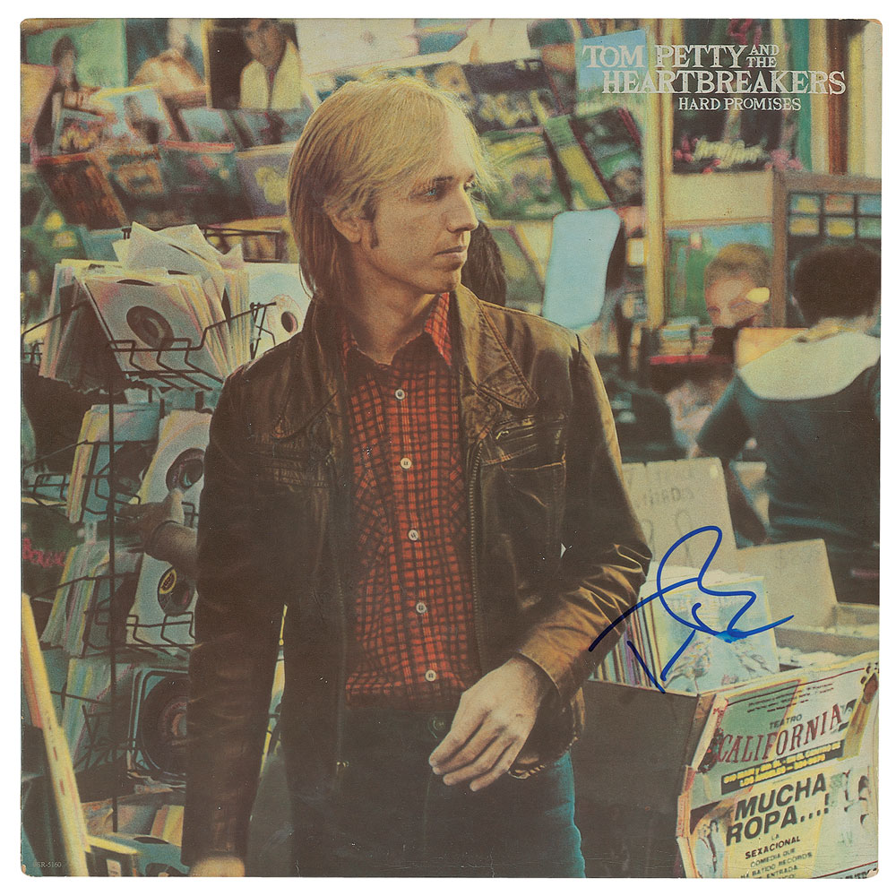 Hard Promises album by Tom Petty and the Heartbreakers, signed on the front cover in blue felt tip by Petty. In fine condition, with a small smudge to his last name. The record is included.