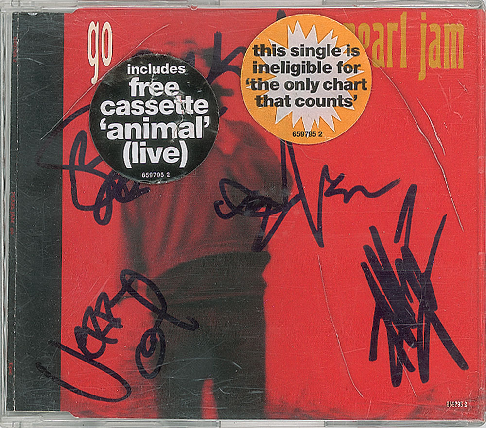 CD single for 'Go' by Pearl Jam, signed on the front of the insert in blue felt tip by Eddie Vedder, Mike McCready, Stone Gossard, Jeff Ament, and Dave Abbruzzese. In fine condition, with a cracked jewel case. The CD is included. From The John Brennan In-person Autograph Collection.