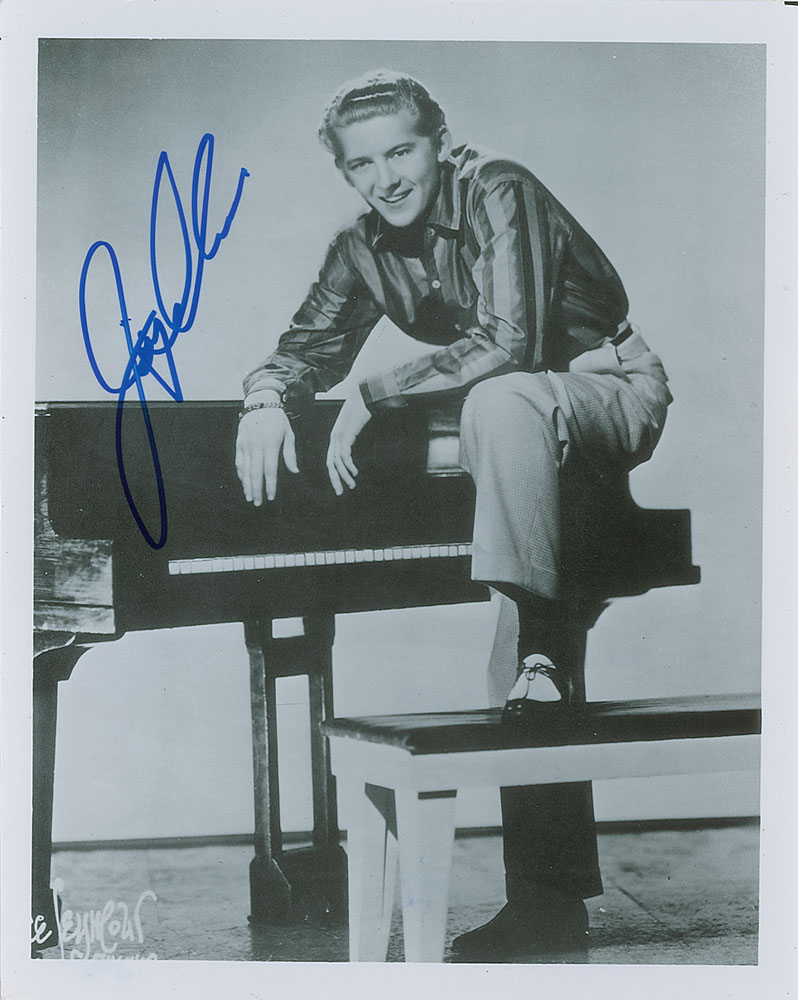 Glossy 8 x 10 photo of ‘The Killer’ posing on his piano, signed in blue felt tip by Jerry Lee Lewis. In fine condition, with a few small surface dings. From The John Brennan In-person Autograph Collection.
