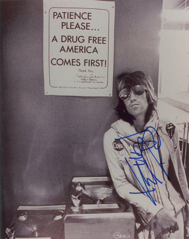 Glossy 11 x 14 half-length photo of Keith Richards leaning on a water fountain under an anti-drug sign, signed in blue felt tip by the Rolling Stones guitarist. In fine condition. From The John Brennan In-person Autograph Collection.